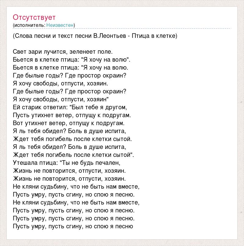 (Слова песни и текст песни В.Леонтьев - Птица в клетке) Свет зари лучится, зеленеет поле. Бьется в клетке птица: "Я хочу на волю". Бьется в клетке птица: "Я хочу на волю. Где былые годы? Где простор окраин? Я хочу свободы, отпусти, хозяин. Где былые годы? Где простор окраин? Я хочу свободы, отпусти, хозяин" Ей старик ответил: "Был тебе я другом, Пусть утихнет ветер, отпущу к подругам. Вот утихнет ветер, отпущу к подругам. Я ль тебя обидел? Боль в душе испита, Ждет тебя погибель после клетки сытой. Я ль тебя обидел? Боль в душе испита, Ждет тебя погибель после клетки сытой". Утешала птица: "Ты не будь печален, Жизнь не повторится, отпусти, хозяин. Жизнь не повторится, отпусти, хозяин. Не кляни судьбину, что не быть нам вместе, Пусть умру, пусть сгину, но спою я песню. Не кляни судьбину, что не быть нам вместе, Пусть умру, пусть сгину, но спою я песню. Пусть умру, пусть сгину, но спою я песню. Пусть умру, пусть сгину, но спою я песню