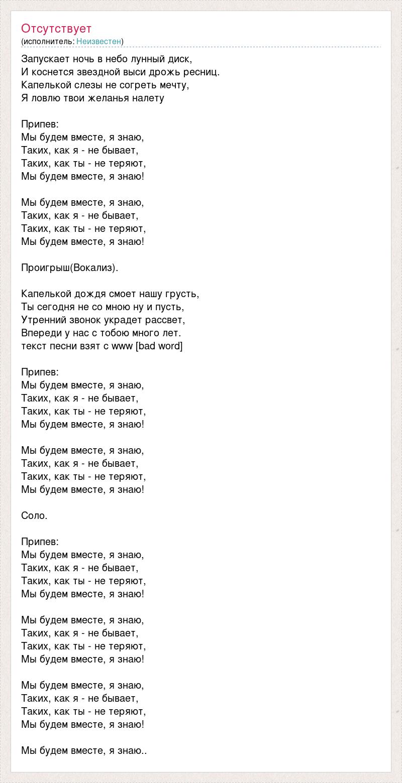 Запускает ночь в небо лунный диск, И коснется звездной выси дрожь ресниц. Капелькой слезы не согреть мечту, Я ловлю твои желанья налету Припев: Мы будем вместе, я знаю, Таких, как я - не бывает, Таких, как ты - не теряют, Мы будем вместе, я знаю! Мы будем вместе, я знаю, Таких, как я - не бывает, Таких, как ты - не теряют, Мы будем вместе, я знаю! Проигрыш(Вокализ). Капелькой дождя смоет нашу грусть, Ты сегодня не со мною ну и пусть, Утренний звонок украдет рассвет, Впереди у нас с тобою много лет. текст песни взят с www [bad word] Припев: Мы будем вместе, я знаю, Таких, как я - не бывает, Таких, как ты - не теряют, Мы будем вместе, я знаю! Мы будем вместе, я знаю, Таких, как я - не бывает, Таких, как ты - не теряют, Мы будем вместе, я знаю! Соло. Припев: Мы будем вместе, я знаю, Таких, как я - не бывает, Таких, как ты - не теряют, Мы будем вместе, я знаю! Мы будем вместе, я знаю, Таких, как я - не бывает, Таких, как ты - не теряют, Мы будем вместе, я знаю! Мы будем вместе, я знаю, Таких, как я - не бывает, Таких, как ты - не теряют, Мы будем вместе, я знаю! Мы будем вместе, я знаю..