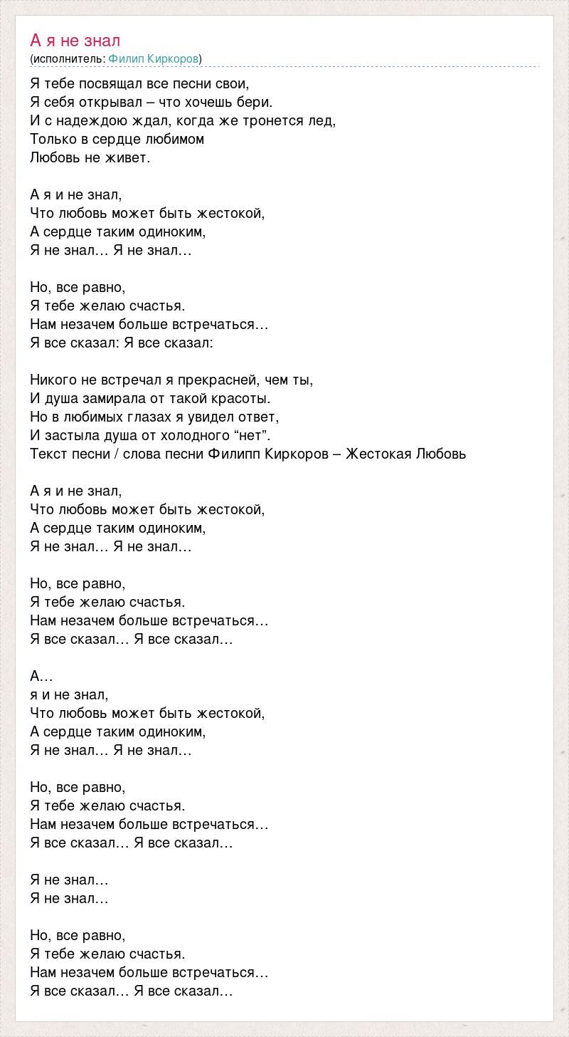 Я тебе посвящал все песни свои, Я себя открывал – что хочешь бери. И с надеждою ждал, когда же тронется лед, Только в сердце любимом Любовь не живет. А я и не знал, Что любовь может быть жестокой, А сердце таким одиноким, Я не знал… Я не знал… Но, все равно, Я тебе желаю счастья. Нам незачем больше встречаться… Я все сказал: Я все сказал: Никого не встречал я прекрасней, чем ты, И душа замирала от такой красоты. Но в любимых глазах я увидел ответ, И застыла душа от холодного “нет”. Текст песни / слова песни Филипп Киркоров – Жестокая Любовь А я и не знал, Что любовь может быть жестокой, А сердце таким одиноким, Я не знал… Я не знал… Но, все равно, Я тебе желаю счастья. Нам незачем больше встречаться… Я все сказал… Я все сказал… А… я и не знал, Что любовь может быть жестокой, А сердце таким одиноким, Я не знал… Я не знал… Но, все равно, Я тебе желаю счастья. Нам незачем больше встречаться… Я все сказал… Я все сказал… Я не знал… Я не знал… Но, все равно, Я тебе желаю счастья. Нам незачем больше встречаться… Я все сказал… Я все сказал…