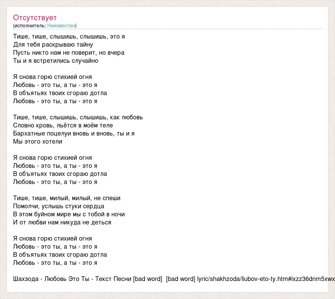 Тише, тише, слышишь, слышишь, это я Для тебя раскрываю тайну Пусть никто нам не поверит, но вчера Ты и я встретились случайно Я снова горю стихией огня Любовь - это ты, а ты - это я В объятьях твоих сгораю дотла Любовь - это ты, а ты - это я Тише, тише, слышишь, слышишь, как любовь Словно кровь, льётся в моём теле Бархатные поцелуи вновь и вновь, ты и я Мы этого хотели Я снова горю стихией огня Любовь - это ты, а ты - это я В объятьях твоих сгораю дотла Любовь - это ты, а ты - это я Тише, тише, милый, милый, не спеши Помолчи, услышь стуки сердца В этом буйном мире мы с тобой в ночи И от любви нам никуда не деться Я снова горю стихией огня Любовь - это ты, а ты - это я В объятьях твоих сгораю дотла Любовь - это ты, а ты - это я Шахзода - Любовь Это Ты - Текст Песни [bad word] [bad word] lyric/shakhzoda/liubov-eto-ty.htm#ixzz36dnm5xwx