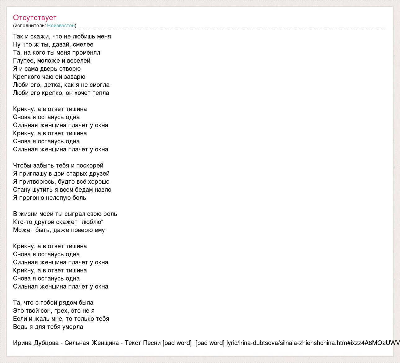 Так и скажи, что не любишь меня Ну что ж ты, давай, смелее Та, на кого ты меня променял Глупее, моложе и веселей Я и сама дверь отворю Крепкого чаю ей заварю Люби его, детка, как я не смогла Люби его крепко, он хочет тепла Крикну, а в ответ тишина Снова я останусь одна Сильная женщина плачет у окна Крикну, а в ответ тишина Снова я останусь одна Сильная женщина плачет у окна Чтобы забыть тебя и поскорей Я приглашу в дом старых друзей Я притворюсь, будто всё хорошо Стану шутить я всем бедам назло Я прогоню нелепую боль В жизни моей ты сыграл свою роль Кто-то другой скажет "люблю" Может быть, даже поверю ему Крикну, а в ответ тишина Снова я останусь одна Сильная женщина плачет у окна Крикну, а в ответ тишина Снова я останусь одна Сильная женщина плачет у окна Та, что с тобой рядом была Это твой сон, грех, это не я Если и жаль мне, то только тебя Ведь я для тебя умерла Ирина Дубцова - Сильная Женщина - Текст Песни [bad word] [bad word] lyric/irina-dubtsova/silnaia-zhienshchina.htm#ixzz4A8MO2UWV