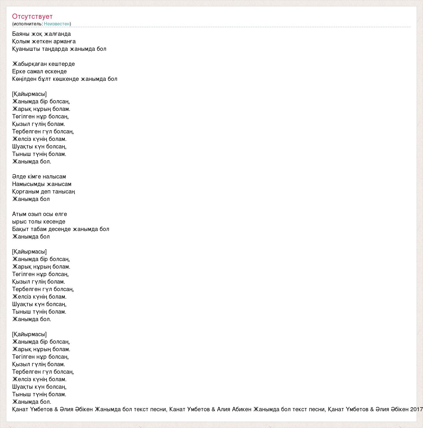 Баяны жоқ жалғанда Қолым жеткен арманға Қуанышты таңдарда жанымда бол Жабырқаған кештерде Ерке самал ескенде Көңілден бұлт көшкенде жанымда бол [Қайырмасы] Жанымда бір болсаң, Жарық нұрың болам. Төгілген нұр болсаң, Қызыл гүлің болам. Тербелген гүл болсаң, Желсіз күнің болам. Шуақты күн болсаң, Тыныш түнің болам. Жанымда бол. Әлде кімге налысам Намысымды жанысам Қорғаным деп танысаң Жанымда бол Атым озып осы елге ырыс толы кесенде Бақыт табам десеңде жанымда бол Жанымда бол [Қайырмасы] Жанымда бір болсаң, Жарық нұрың болам. Төгілген нұр болсаң, Қызыл гүлің болам. Тербелген гүл болсаң, Желсіз күнің болам. Шуақты күн болсаң, Тыныш түнің болам. Жанымда бол. [Қайырмасы] Жанымда бір болсаң, Жарық нұрың болам. Төгілген нұр болсаң, Қызыл гүлің болам. Тербелген гүл болсаң, Желсіз күнің болам. Шуақты күн болсаң, Тыныш түнің болам. Жанымда бол. Қанат Үмбетов & Әлия Әбікен Жанымда бол текст песни, Канат Умбетов & Алия Абикен Жанымда бол текст песни, Қанат Үмбетов & Әлия Әбікен 2017