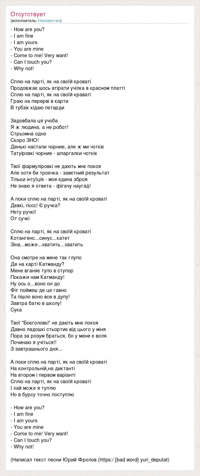 - How are you? - I am fine - I am yours - You are mine - Come to me! Very want! - Can I touch you? - Why not! Сплю на парті, як на своїй кроваті Продовжає шось втірати учілка в красном платті Сплю на парті, як на своїй краваті Граю на перерві в карти В тубзік кідаю пєтарди Задовбала ця учоба Я ж людина, а не робот! Стрьомна одно Скоро ЗНО! Денькі настали чорние, але ж ми чоткіє Татуіровкі чорние - шпаргалки чоткіє Твої фармуліровкі не дають мнє покоя Але хотя би троєчка - завєтний результат Тільки інтуїція - моя єдина зброя Не знаю я ответа - фігачу наугад! А поки сплю на парті, як на своїй кроваті Дєвкі, пссс! Є ручка? Нєту ручкі! От сучкі Сплю на парті, як на своїй кроваті Котангенс...синус...катет Зіна...може...хватить...хватить Она смотре на мене так глупо Де на карті Катманду? Мене вганяє тупо в ступор Покажи нам Катманду! Ну ось о...воно он до Фіг поймеш де це гавно Та пішло воно все в дупу! Завтра батю в школу! Сука Твої "Боєголовкі" не дають мнє покоя Давно ладошкі стьортиє від цього у міня Пора за розум браться, бо у мене є воля Починаю я учіться!! З завтрашнього дня... А поки сплю на парті, як на своїй кроваті На контрольній,на диктанті На втором і первом варіанті Сплю на парті, як на своїй кроваті І хай може я туплю Но в бурсу точно поступлю - How are you? - I am fine - I am yours - You are mine - Come to me! Very want! - Can I touch you? - Why not! (Написал текст песни Юрий Фролов (https:/ [bad word] yuri_deputat)
