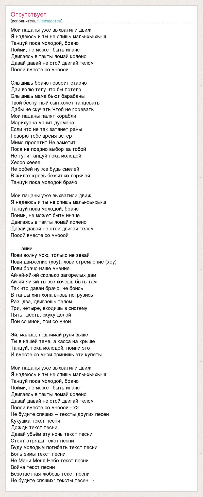 Мои пацаны уже выхватили движ Я надеюсь и ты не спишь малы-хы-хы-ш Танцуй пока молодой, брачо Пойми, не может быть иначе Двигаясь в такты ломай колено Давай давай не стой двигай телом Пооой вместе со мнооой Слышишь брачо говорит старчо Дай волю телу что бы потело Слышишь мама бьют барабаны Твой беспутный сын хочет танцевать Дабы не скучать Чтоб не горевать Мои пацаны палят корабли Марихуана манит дурмана Если что не так затянет раны Говорю тебе время ветер Мимо пролетит Не заметит Пока не поздно выбор за тобой Не тупи танцуй пока молодой Хеооо хееее Не робей ну же будь смелей В жилах кровь бежит их горячая Танцуй пока молодой брачо Мои пацаны уже выхватили движ Я надеюсь и ты не спишь малы-хы-хы-ш Танцуй пока молодой, брачо Пойми, не может быть иначе Двигаясь в такты ломай колено Давай давай не стой двигай телом Пооой вместе со мнооой .......аййй Лови волну мою, только не зевай Лови движение (хоу), лови стремление (хоу) Лови брачо наше мнение Ай-яй-яй-яй сколько загорелых дам Ай-яй-яй-яй ты же хочешь быть там Так что давай брачо, не боись В танцы хип-хопа вновь погрузись Раз, два, двигаешь телом Три, четыре, входишь в систему Пять, шесть, скуку долой Пой со мной, пой со мной Эй, малыш, поднимай руки выше Ты в нашей теме, а касса на крыше Танцуй, пока молодой, помни это И вместе со мной помнишь эти купеты Мои пацаны уже выхватили движ Я надеюсь и ты не спишь малы-хы-хы-ш Танцуй пока молодой, брачо Пойми, не может быть иначе Двигаясь в такты ломай колено Давай давай не стой двигай телом Пооой вместе со мнооой - х2 Не будите спящих – тексты других песен Кукушка текст песни Дождь текст песни Давай убьём эту ночь текст песни Стоят отряды текст песни Буду молодым погибать текст песни Боль зимы текст песни Не Мани Меня Небо текст песни Война текст песни Безответная любовь текст песни Не будите спящих: тексты песен →