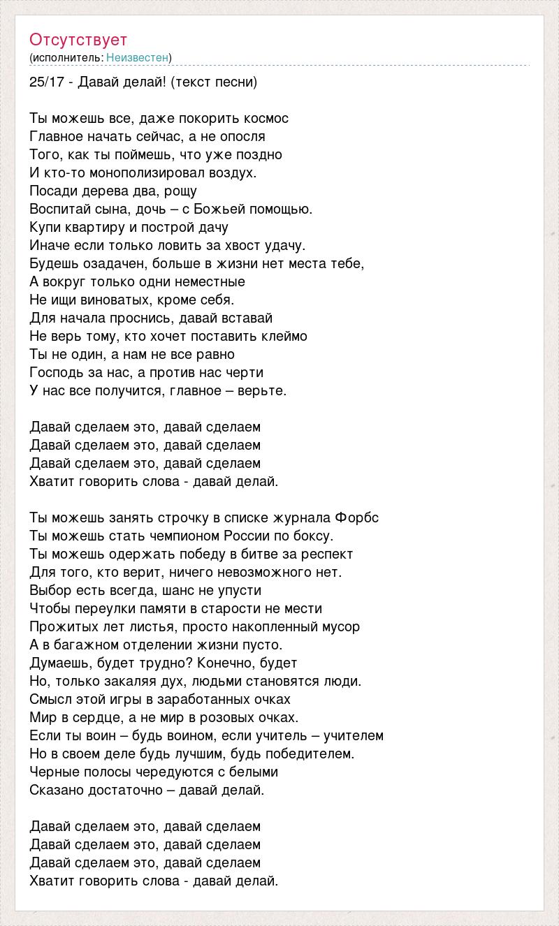 25/17 - Давай делай! (текст песни) Ты можешь все, даже покорить космос Главное начать сейчас, а не опосля Того, как ты поймешь, что уже поздно И кто-то монополизировал воздух. Посади дерева два, рощу Воспитай сына, дочь – с Божьей помощью. Купи квартиру и построй дачу Иначе если только ловить за хвост удачу. Будешь озадачен, больше в жизни нет места тебе, А вокруг только одни неместные Не ищи виноватых, кроме себя. Для начала проснись, давай вставай Не верь тому, кто хочет поставить клеймо Ты не один, а нам не все равно Господь за нас, а против нас черти У нас все получится, главное – верьте. Давай сделаем это, давай сделаем Давай сделаем это, давай сделаем Давай сделаем это, давай сделаем Хватит говорить слова - давай делай. Ты можешь занять строчку в списке журнала Форбс Ты можешь стать чемпионом России по боксу. Ты можешь одержать победу в битве за респект Для того, кто верит, ничего невозможного нет. Выбор есть всегда, шанс не упусти Чтобы переулки памяти в старости не мести Прожитых лет листья, просто накопленный мусор А в багажном отделении жизни пусто. Думаешь, будет трудно? Конечно, будет Но, только закаляя дух, людьми становятся люди. Смысл этой игры в заработанных очках Мир в сердце, а не мир в розовых очках. Если ты воин – будь воином, если учитель – учителем Но в своем деле будь лучшим, будь победителем. Черные полосы чередуются с белыми Сказано достаточно – давай делай. Давай сделаем это, давай сделаем Давай сделаем это, давай сделаем Давай сделаем это, давай сделаем Хватит говорить слова - давай делай.