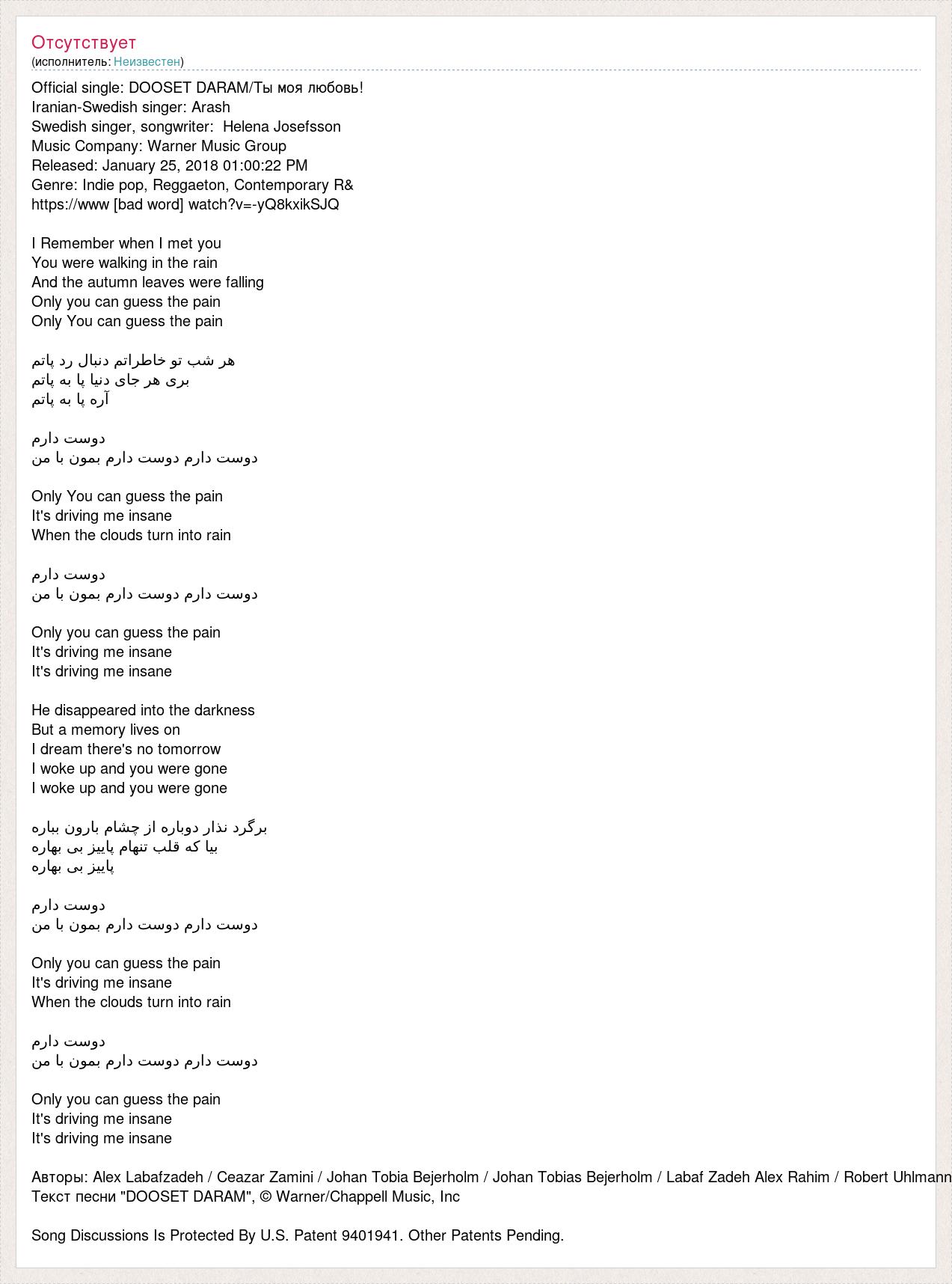 Official single: DOOSET DARAM/Ты моя любовь! Iranian-Swedish singer: Arash Swedish singer, songwriter: Helena Josefsson Music Company: Warner Music Group Released: January 25, 2018 01:00:22 PM Genre: Indie pop, Reggaeton, Contemporary R& https://www [bad word] watch?v=-yQ8kxikSJQ I Remember when I met you You were walking in the rain And the autumn leaves were falling Only you can guess the pain Only You can guess the pain هر شب تو خاطراتم دنبال رد پاتم بری هر جای دنیا پا به پاتم آره پا به پاتم دوست دارم دوست دارم دوست دارم بمون با من Only You can guess the pain It's driving me insane When the clouds turn into rain دوست دارم دوست دارم دوست دارم بمون با من Only you can guess the pain It's driving me insane It's driving me insane He disappeared into the darkness But a memory lives on I dream there's no tomorrow I woke up and you were gone I woke up and you were gone برگرد نذار دوباره از چشام بارون بباره بیا که قلب تنهام پاییز بی بهاره پاییز بی بهاره دوست دارم دوست دارم دوست دارم بمون با من Only you can guess the pain It's driving me insane When the clouds turn into rain دوست دارم دوست دارم دوست دارم بمون با من Only you can guess the pain It's driving me insane It's driving me insane Авторы: Alex Labafzadeh / Ceazar Zamini / Johan Tobia Bejerholm / Johan Tobias Bejerholm / Labaf Zadeh Alex Rahim / Robert Uhlmann Текст песни "DOOSET DARAM", © Warner/Chappell Music, Inc Song Discussions Is Protected By U.S. Patent 9401941. Other Patents Pending.