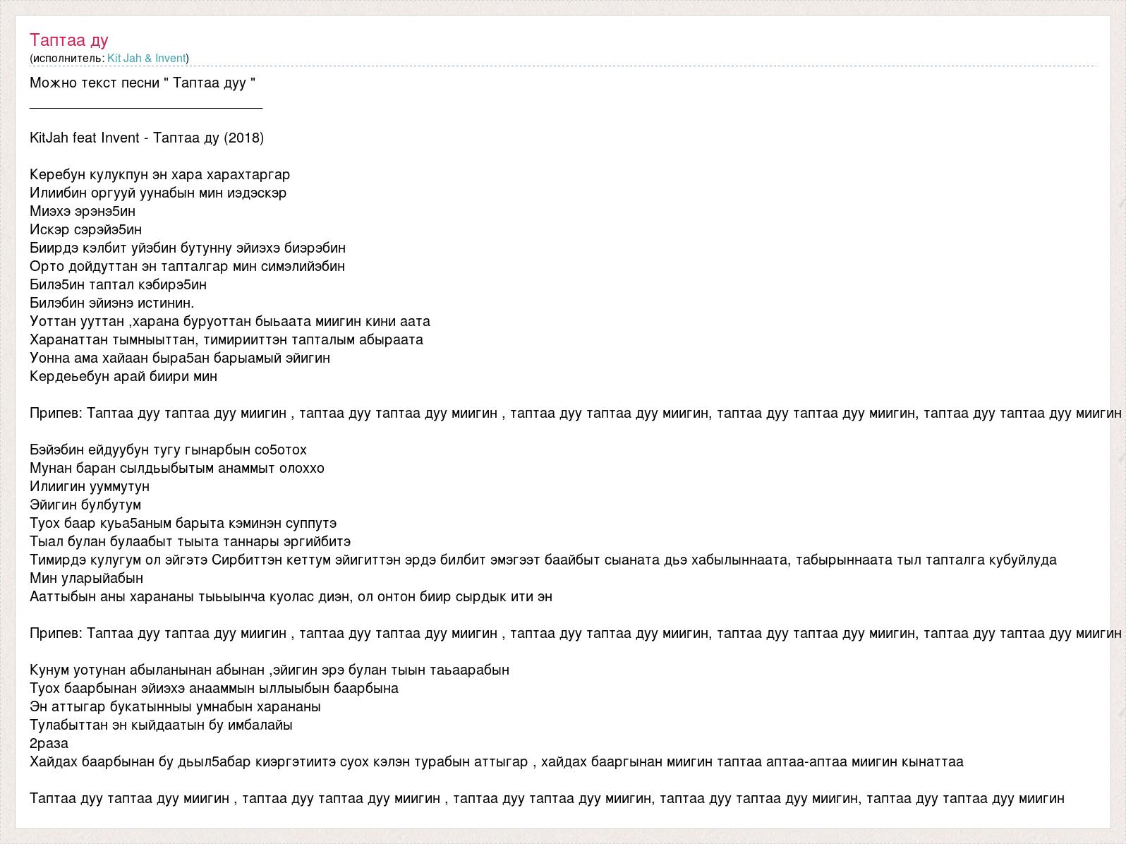 Можно текст песни " Таптаа дуу " ______________________________ KitJah feat Invent - Таптаа ду (2018) Керебун кулукпун эн хара харахтаргар Илиибин оргууй уунабын мин иэдэскэр Миэхэ эрэнэ5ин Искэр сэрэйэ5ин Биирдэ кэлбит уйэбин бутунну эйиэхэ биэрэбин Орто дойдуттан эн тапталгар мин симэлийэбин Билэ5ин таптал кэбирэ5ин Билэбин эйиэнэ истинин. Уоттан ууттан ,харана буруоттан быьаата миигин кини аата Харанаттан тымныыттан, тимирииттэн тапталым абыраата Уонна ама хайаан быра5ан барыамый эйигин Кердеьебун арай биири мин Припев: Таптаа дуу таптаа дуу миигин , таптаа дуу таптаа дуу миигин , таптаа дуу таптаа дуу миигин, таптаа дуу таптаа дуу миигин, таптаа дуу таптаа дуу миигин Бэйэбин ейдуубун тугу гынарбын со5отох Мунан баран сылдьыбытым анаммыт олоххо Илиигин ууммутун Эйигин булбутум Туох баар куьа5аным барыта кэминэн суппутэ Тыал булан булаабыт тыыта таннары эргийбитэ Тимирдэ кулугум ол эйгэтэ Сирбиттэн кеттум эйигиттэн эрдэ билбит эмэгээт баайбыт сыаната дьэ хабылыннаата, табырыннаата тыл тапталга кубуйлуда Мин уларыйабын Ааттыбын аны харананы тыьыынча куолас диэн, ол онтон биир сырдык ити эн Припев: Таптаа дуу таптаа дуу миигин , таптаа дуу таптаа дуу миигин , таптаа дуу таптаа дуу миигин, таптаа дуу таптаа дуу миигин, таптаа дуу таптаа дуу миигин Кунум уотунан абыланынан абынан ,эйигин эрэ булан тыын таьаарабын Туох баарбынан эйиэхэ анааммын ыллыыбын баарбына Эн аттыгар букатынныы умнабын харананы Тулабыттан эн кыйдаатын бу имбалайы 2раза Хайдах баарбынан бу дьыл5абар киэргэтиитэ суох кэлэн турабын аттыгар , хайдах бааргынан миигин таптаа аптаа-аптаа миигин кынаттаа Таптаа дуу таптаа дуу миигин , таптаа дуу таптаа дуу миигин , таптаа дуу таптаа дуу миигин, таптаа дуу таптаа дуу миигин, таптаа дуу таптаа дуу миигин