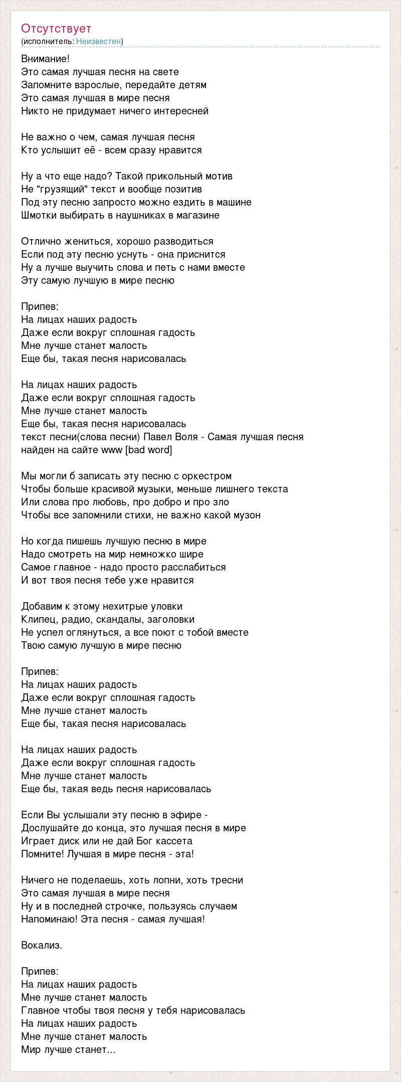 Внимание! Это самая лучшая песня на свете Запомните взрослые, передайте детям Это самая лучшая в мире песня Никто не придумает ничего интересней Не важно о чем, самая лучшая песня Кто услышит её - всем сразу нравится Ну а что еще надо? Такой прикольный мотив Не "грузящий" текст и вообще позитив Под эту песню запросто можно ездить в машине Шмотки выбирать в наушниках в магазине Отлично жениться, хорошо разводиться Если под эту песню уснуть - она приснится Ну а лучше выучить слова и петь с нами вместе Эту самую лучшую в мире песню Припев: На лицах наших радость Даже если вокруг сплошная гадость Мне лучше станет малость Еще бы, такая песня нарисовалась На лицах наших радость Даже если вокруг сплошная гадость Мне лучше станет малость Еще бы, такая песня нарисовалась текст песни(слова песни) Павел Воля - Самая лучшая песня найден на сайте www [bad word] Мы могли б записать эту песню с оркестром Чтобы больше красивой музыки, меньше лишнего текста Или слова про любовь, про добро и про зло Чтобы все запомнили стихи, не важно какой музон Но когда пишешь лучшую песню в мире Надо смотреть на мир немножко шире Самое главное - надо просто расслабиться И вот твоя песня тебе уже нравится Добавим к этому нехитрые уловки Клипец, радио, скандалы, заголовки Не успел оглянуться, а все поют с тобой вместе Твою самую лучшую в мире песню Припев: На лицах наших радость Даже если вокруг сплошная гадость Мне лучше станет малость Еще бы, такая песня нарисовалась На лицах наших радость Даже если вокруг сплошная гадость Мне лучше станет малость Еще бы, такая ведь песня нарисовалась Если Вы услышали эту песню в эфире - Дослушайте до конца, это лучшая песня в мире Играет диск или не дай Бог кассета Помните! Лучшая в мире песня - эта! Ничего не поделаешь, хоть лопни, хоть тресни Это самая лучшая в мире песня Ну и в последней строчке, пользуясь случаем Напоминаю! Эта песня - самая лучшая! Вокализ. Припев: На лицах наших радость Мне лучше станет малость Главное чтобы твоя песня у тебя нарисовалась На лицах наших радость Мне лучше станет малость Мир лучше станет...