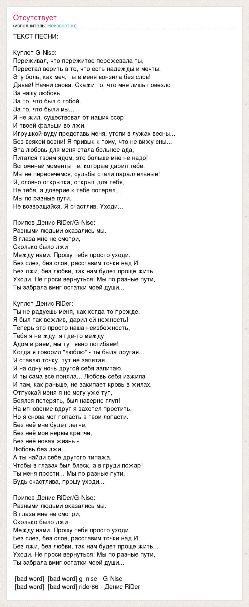 ТЕКСТ ПЕСНИ: Куплет G-Nise: Переживал, что пережитое пережевала ты, Перестал верить в то, что есть надежды и мечты. Эту боль, как меч, ты в меня вонзила без слов! Давай! Начни снова. Скажи то, что мне лишь повезло За нашу любовь, За то, что был с тобой, За то, что были мы... Я не жил, существовал от наших ссор И твоей фальши во лжи. Игрушкой-вуду представь меня, утопи в лужах весны... Без всякой возни! Я привык к тому, что не вижу сны... Эта любовь для меня стала больнее ада, Питался твоим ядом, это больше мне не надо! Вспоминай моменты те, которые дарил тебе. Мы не пересечемся, судьбы стали параллельные! Я, словно открытка, открыт для тебя, Не тебя, а доверие к тебе потерял... Мы по разные пути. Не возвращайся. Я счастлив. Уходи... Припев Денис RiDer/G-Nise: Разными людьми оказались мы. В глаза мне не смотри, Сколько было лжи Между нами. Прошу тебя просто уходи. Без слез, без слов, расставим точки над И. Без лжи, без любви, так нам будет проще жить... Уходи. Не проси вернуться! Мы по разные пути, Ты забрала вмиг остатки моей души... Куплет Денис RiDer: Ты не радуешь меня, как когда-то прежде. Я был так вежлив, дарил ей нежность! Теперь это просто наша неизбежность, Тебя я не жду, я где-то между Адом и раем, мы тут явно погибаем! Когда я говорил "люблю" - ты была другая... Я ставлю точку, тут не запятая, Я на одну ночь другой себя запитаю. И ты сама все поняла... Любовь себя изжила И там, как раньше, не закипает кровь в жилах. Отпускай меня я не могу уже тут, Боялся потерять, был наверно глуп! На мгновение вдруг я захотел простить, Но я снова мог попасть в твои лопасти. Без неё мне будет легче, Без неё мои нервы крепче, Без неё новая жизнь - Любовь без лжи... А ты найди себе другого типажа, Чтобы в глазах был блеск, а в груди пожар! Ты меня прости... Мы по разные пути, Будь счастлива, прошу уходи... Припев Денис RiDer/G-Nise: Разными людьми оказались мы. В глаза мне не смотри, Сколько было лжи Между нами. Прошу тебя просто уходи. Без слез, без слов, расставим точки над И. Без лжи, без любви, так нам будет проще жить... Уходи. Не проси вернуться! Мы по разные пути, Ты забрала вмиг остатки моей души... [bad word] [bad word] g_nise - G-Nise [bad word] [bad word] rider86 - Денис RiDer