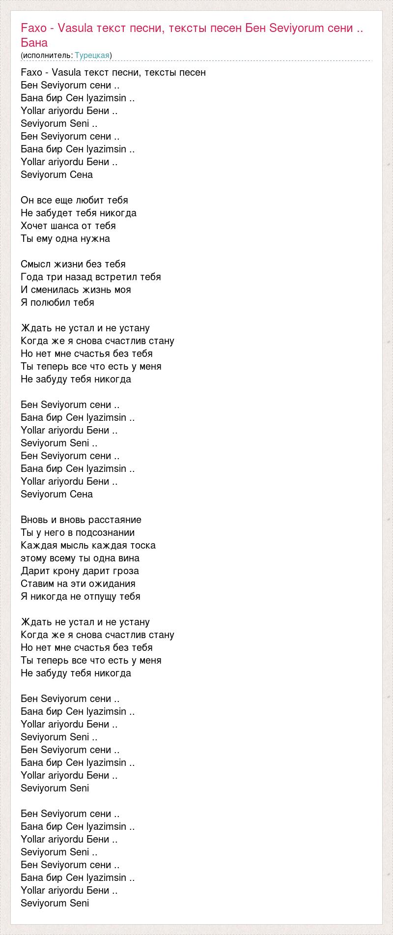 Faxo - Vasula текст песни, тексты песен Бен Seviyorum сени .. Бана бир Сен lyazimsin .. Yollar ariyordu Бени .. Seviyorum Seni .. Бен Seviyorum сени .. Бана бир Сен lyazimsin .. Yollar ariyordu Бени .. Seviyorum Сена Он все еще любит тебя Не забудет тебя никогда Хочет шанса от тебя Ты ему одна нужна Смысл жизни без тебя Года три назад встретил тебя И сменилась жизнь моя Я полюбил тебя Ждать не устал и не устану Когда же я снова счастлив стану Но нет мне счастья без тебя Ты теперь все что есть у меня Не забуду тебя никогда Бен Seviyorum сени .. Бана бир Сен lyazimsin .. Yollar ariyordu Бени .. Seviyorum Seni .. Бен Seviyorum сени .. Бана бир Сен lyazimsin .. Yollar ariyordu Бени .. Seviyorum Сена Вновь и вновь расстаяние Ты у него в подсознании Каждая мысль каждая тоска этому всему ты одна вина Дарит крону дарит гроза Ставим на эти ожидания Я никогда не отпущу тебя Ждать не устал и не устану Когда же я снова счастлив стану Но нет мне счастья без тебя Ты теперь все что есть у меня Не забуду тебя никогда Бен Seviyorum сени .. Бана бир Сен lyazimsin .. Yollar ariyordu Бени .. Seviyorum Seni .. Бен Seviyorum сени .. Бана бир Сен lyazimsin .. Yollar ariyordu Бени .. Seviyorum Seni Бен Seviyorum сени .. Бана бир Сен lyazimsin .. Yollar ariyordu Бени .. Seviyorum Seni .. Бен Seviyorum сени .. Бана бир Сен lyazimsin .. Yollar ariyordu Бени .. Seviyorum Seni