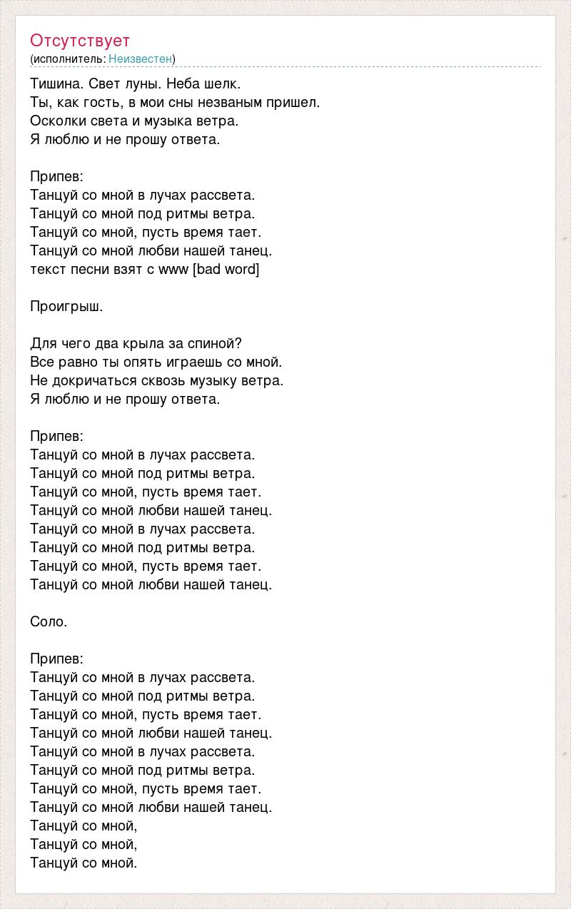 Тишина. Свет луны. Неба шелк. Ты, как гость, в мои сны незваным пришел. Осколки света и музыка ветра. Я люблю и не прошу ответа. Припев: Танцуй со мной в лучах рассвета. Танцуй со мной под ритмы ветра. Танцуй со мной, пусть время тает. Танцуй со мной любви нашей танец. текст песни взят с www [bad word] Проигрыш. Для чего два крыла за спиной? Все равно ты опять играешь со мной. Не докричаться сквозь музыку ветра. Я люблю и не прошу ответа. Припев: Танцуй со мной в лучах рассвета. Танцуй со мной под ритмы ветра. Танцуй со мной, пусть время тает. Танцуй со мной любви нашей танец. Танцуй со мной в лучах рассвета. Танцуй со мной под ритмы ветра. Танцуй со мной, пусть время тает. Танцуй со мной любви нашей танец. Соло. Припев: Танцуй со мной в лучах рассвета. Танцуй со мной под ритмы ветра. Танцуй со мной, пусть время тает. Танцуй со мной любви нашей танец. Танцуй со мной в лучах рассвета. Танцуй со мной под ритмы ветра. Танцуй со мной, пусть время тает. Танцуй со мной любви нашей танец. Танцуй со мной, Танцуй со мной, Танцуй со мной.