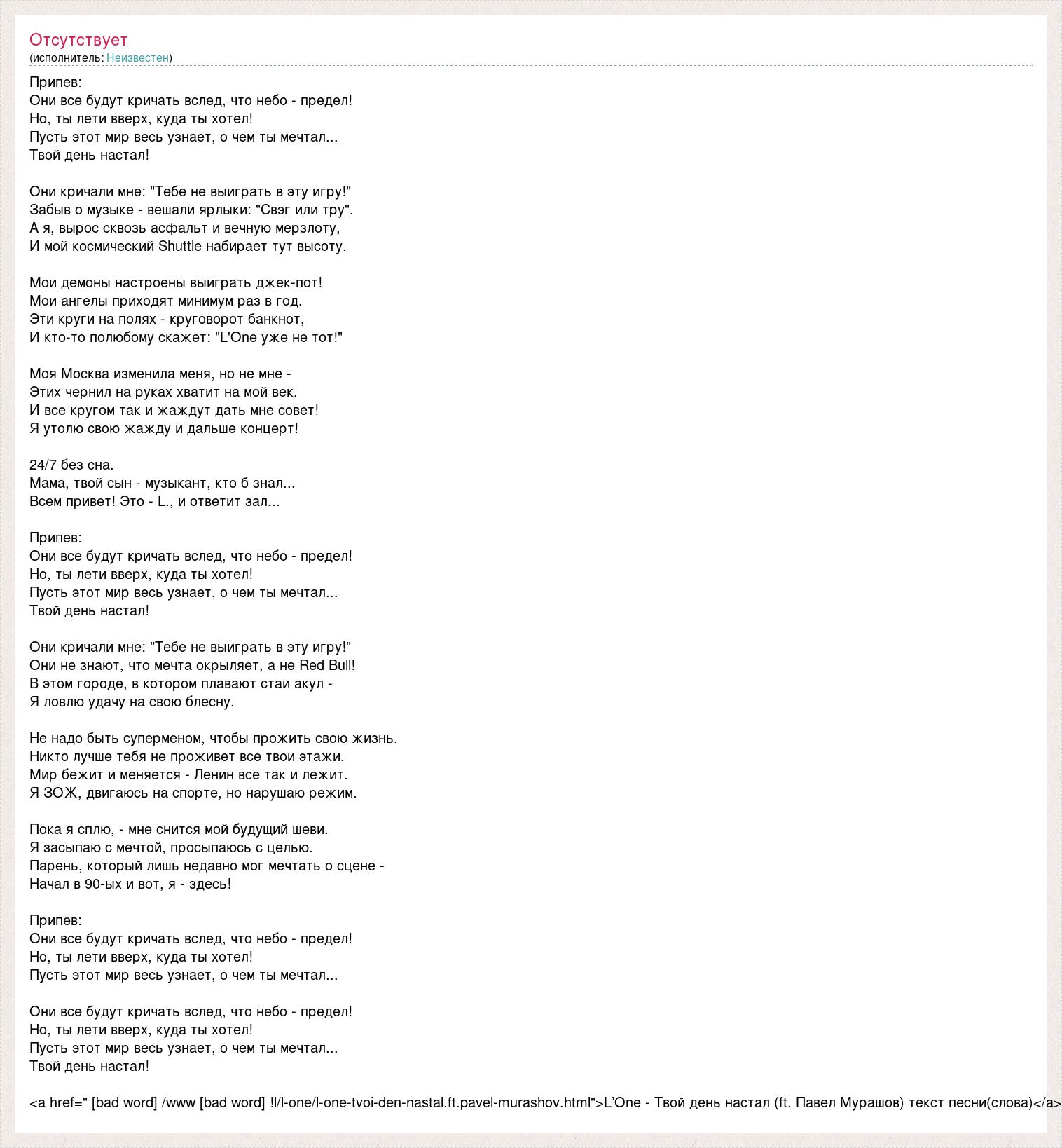 Припев: Они все будут кричать вслед, что небо - предел! Но, ты лети вверх, куда ты хотел! Пусть этот мир весь узнает, о чем ты мечтал... Твой день настал! Они кричали мне: "Тебе не выиграть в эту игру!" Забыв о музыке - вешали ярлыки: "Свэг или тру". А я, вырос сквозь асфальт и вечную мерзлоту, И мой космический Shuttle набирает тут высоту. Мои демоны настроены выиграть джек-пот! Мои ангелы приходят минимум раз в год. Эти круги на полях - круговорот банкнот, И кто-то полюбому скажет: "L'One уже не тот!" Моя Москва изменила меня, но не мне - Этих чернил на руках хватит на мой век. И все кругом так и жаждут дать мне совет! Я утолю свою жажду и дальше концерт! 24/7 без сна. Мама, твой сын - музыкант, кто б знал... Всем привет! Это - L., и ответит зал... Припев: Они все будут кричать вслед, что небо - предел! Но, ты лети вверх, куда ты хотел! Пусть этот мир весь узнает, о чем ты мечтал... Твой день настал! Они кричали мне: "Тебе не выиграть в эту игру!" Они не знают, что мечта окрыляет, а не Red Bull! В этом городе, в котором плавают стаи акул - Я ловлю удачу на свою блесну. Не надо быть суперменом, чтобы прожить свою жизнь. Никто лучше тебя не проживет все твои этажи. Мир бежит и меняется - Ленин все так и лежит. Я ЗОЖ, двигаюсь на спорте, но нарушаю режим. Пока я сплю, - мне снится мой будущий шеви. Я засыпаю с мечтой, просыпаюсь с целью. Парень, который лишь недавно мог мечтать о сцене - Начал в 90-ых и вот, я - здесь! Припев: Они все будут кричать вслед, что небо - предел! Но, ты лети вверх, куда ты хотел! Пусть этот мир весь узнает, о чем ты мечтал... Они все будут кричать вслед, что небо - предел! Но, ты лети вверх, куда ты хотел! Пусть этот мир весь узнает, о чем ты мечтал... Твой день настал! <a href=" [bad word] /www [bad word] !l/l-one/l-one-tvoi-den-nastal.ft.pavel-murashov.html">L’One - Твой день настал (ft. Павел Мурашов) текст песни(слова)</a>