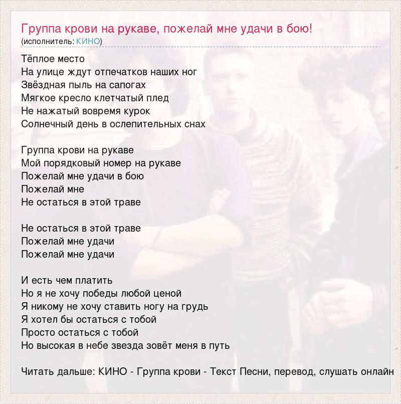 Тёплое место На улице ждут отпечатков наших ног Звёздная пыль на сапогах Мягкое кресло клетчатый плед Не нажатый вовремя курок Солнечный день в ослепительных снах Группа крови на рукаве Мой порядковый номер на рукаве Пожелай мне удачи в бою Пожелай мне Не остаться в этой траве Не остаться в этой траве Пожелай мне удачи Пожелай мне удачи И есть чем платить Но я не хочу победы любой ценой Я никому не хочу ставить ногу на грудь Я хотел бы остаться с тобой Просто остаться с тобой Но высокая в небе звезда зовёт меня в путь Читать дальше: КИНО - Группа крови - Текст Песни, перевод, слушать онлайн
