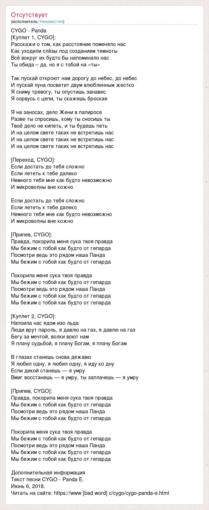 CYGO - Panda [Куплет 1, CYGO]: Расскажи о том, как расстояние поменяло нас Как уходили слёзы под созданием темноты Всё вокруг их будто бы напоминало нас Ты обида – да, но я с тобой на «ты» Так пускай откроют нам дорогу до небес, до небес И пускай луна посветит двум влюбленным жестко Я сниму тревогу, ты опустишь занавес Я сорвусь с цепи, ты скажешь броская Я на заносах, дело Жени в папиросе Разве ты спросишь, кому ты сносишь ты Твоё дело не кипеть, и ты будешь петь И на целом свете таких не встретишь нас И на целом свете таких не встретишь нас И на целом свете таких не встретишь нас [Переход, CYGO]: Если достать до тебя сложно Если лететь к тебе далеко Немного тебя мне как будто невозможно И микроволны вне кожно Если достать до тебя сложно Если лететь к тебе далеко Немного тебя мне как будто невозможно И микроволны вне кожно [Припев, CYGO]: Правда, покорила меня сука твоя правда Мы бежим с тобой как будто от гепарда Посмотри ведь это рядом наша Панда Мы бежим с тобой как будто от гепарда Покорила меня сука твоя правда Мы бежим с тобой как будто от гепарда Посмотри ведь это рядом наша Панда Мы бежим с тобой как будто от гепарда Мы бежим с тобой как будто от гепарда [Куплет 2, CYGO]: Напоила нас ядом изо льда Люди врут пароль, я давлю на газ, я давлю на газ Бегу за мечтой, волки воют нам Я плачу судьбой, я плачу Богам, я плачу Богам В глазах станешь снова дежавю Я любил одну, я любил одну, я иду ко дну Если дикой станешь — я умру Вмиг восстанешь — я умру, ты заплачешь — я умру [Припев, CYGO]: Правда, покорила меня сука твоя правда Мы бежим с тобой как будто от гепарда Посмотри ведь это рядом наша Панда Мы бежим с тобой как будто от гепарда Покорила меня сука твоя правда Мы бежим с тобой как будто от гепарда Посмотри ведь это рядом наша Панда Мы бежим с тобой как будто от гепарда Мы бежим с тобой как будто от гепарда Дополнительная информация Текст песни CYGO - Panda E. Июнь 6, 2018. Читать на сайте: https://www [bad word] c/cygo/cygo-panda-e.html