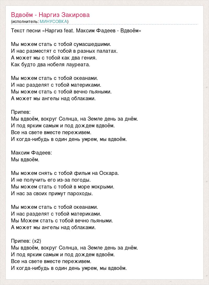 Текст песни «Наргиз feat. Максим Фадеев - Вдвоём» Мы можем стать с тобой сумасшедшими. И нас разместят с тобой в разных палатах. А может мы с тобой как два гения. Как будто два нобеля лауреата. Мы можем стать с тобой океанами. И нас разделят с тобой материками. Мы можем стать с тобой вечно пьяными. А может мы ангелы над облаками. Припев: Мы вдвоём, вокруг Солнца, на Земле день за днём. И под ярким самым и под дождем вдвоём. Все на свете вместе переживем. И когда-нибудь в один день умрем, мы вдвоём. Максим Фадеев: Мы вдвоём. Мы можем снять с тобой фильм на Оскара. И не получить его из-за погоды. Мы можем стать с тобой в море мокрыми. И нас за своих примут пароходы. Мы можем стать с тобой океанами. И нас разделят с тобой материками. Мы Можем стать с тобой вечно пьяными. А может мы ангелы над облаками. Припев: (х2) Мы вдвоём, вокруг Солнца, на Земле день за днём. И под ярким самым и под дождем вдвоём. Все на свете вместе переживем. И когда-нибудь в один день умрем, мы вдвоём.