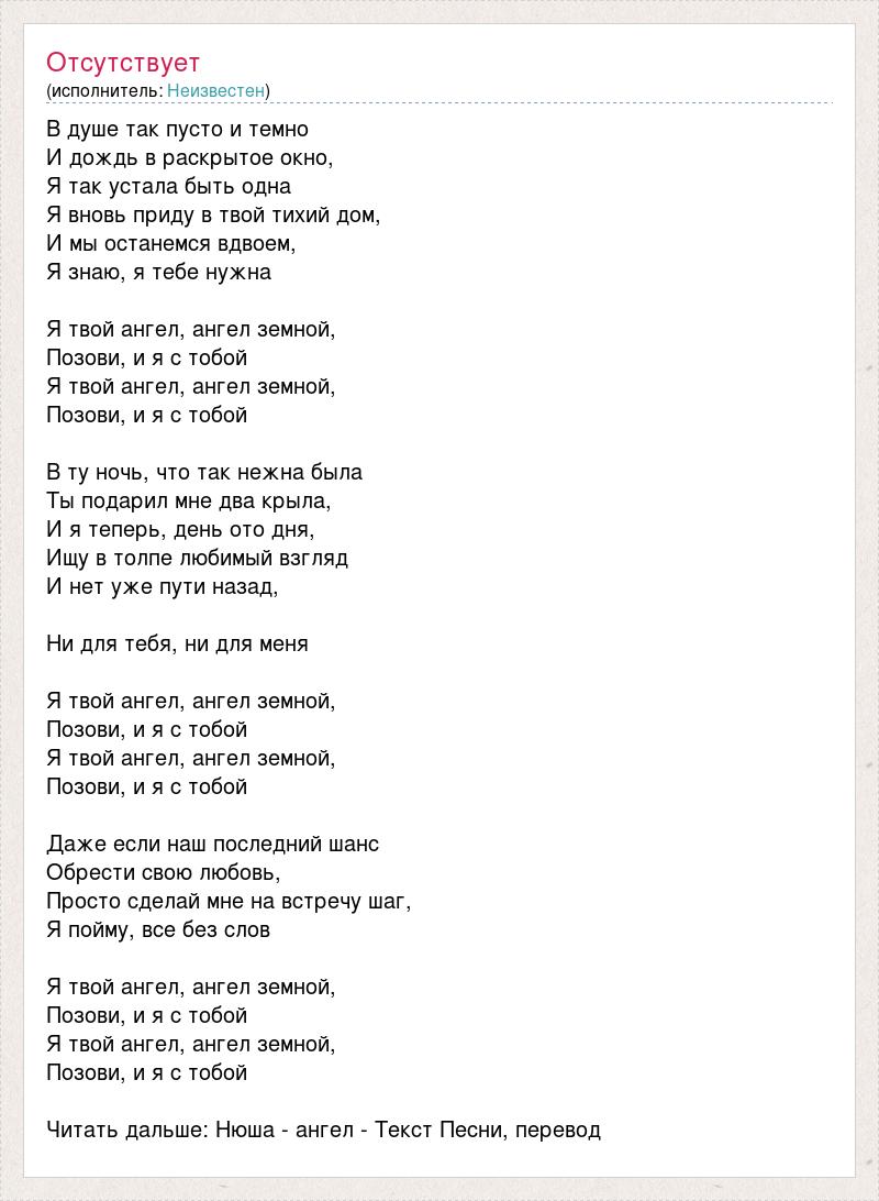 В душе так пусто и темно И дождь в раскрытое окно, Я так устала быть одна Я вновь приду в твой тихий дом, И мы останемся вдвоем, Я знаю, я тебе нужна Я твой ангел, ангел земной, Позови, и я с тобой Я твой ангел, ангел земной, Позови, и я с тобой В ту ночь, что так нежна была Ты подарил мне два крыла, И я теперь, день ото дня, Ищу в толпе любимый взгляд И нет уже пути назад, Ни для тебя, ни для меня Я твой ангел, ангел земной, Позови, и я с тобой Я твой ангел, ангел земной, Позови, и я с тобой Даже если наш последний шанс Обрести свою любовь, Просто сделай мне на встречу шаг, Я пойму, все без слов Я твой ангел, ангел земной, Позови, и я с тобой Я твой ангел, ангел земной, Позови, и я с тобой Читать дальше: Нюша - ангел - Текст Песни, перевод