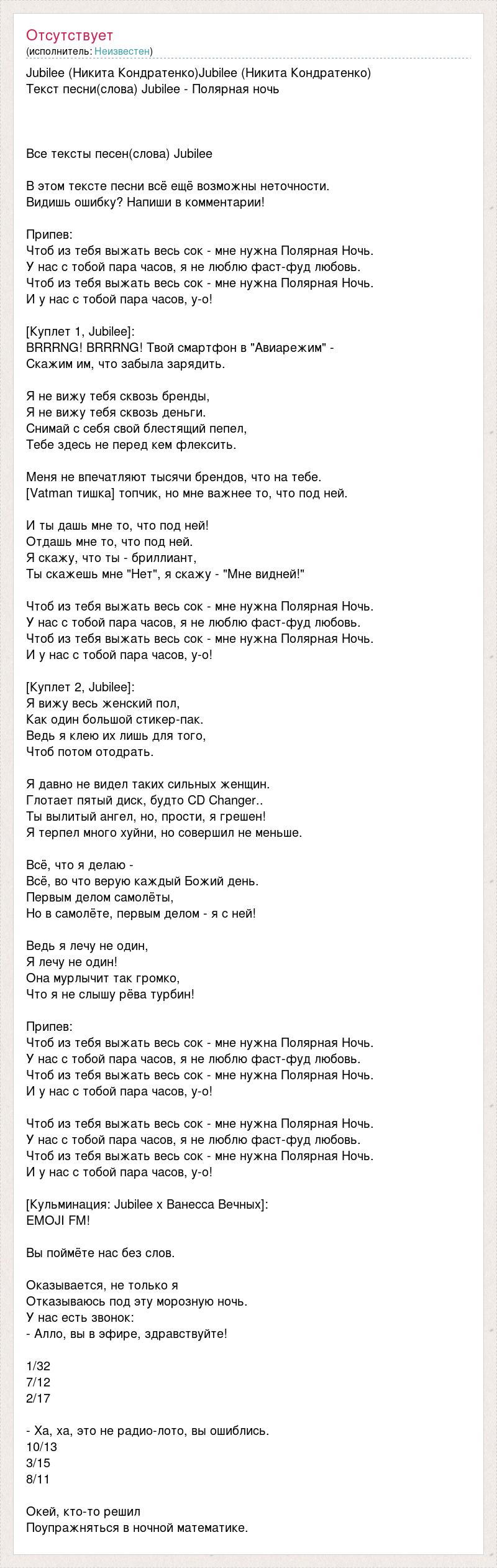 Jubilee (Никита Кондратенко)Jubilee (Никита Кондратенко) Текст песни(слова) Jubilee - Полярная ночь Все тексты песен(слова) Jubilee В этом тексте песни всё ещё возможны неточности. Видишь ошибку? Напиши в комментарии! Припев: Чтоб из тебя выжать весь сок - мне нужна Полярная Ночь. У нас с тобой пара часов, я не люблю фаст-фуд любовь. Чтоб из тебя выжать весь сок - мне нужна Полярная Ночь. И у нас с тобой пара часов, у-о! [Куплет 1, Jubilee]: BRRRNG! BRRRNG! Твой смартфон в "Авиарежим" - Скажим им, что забыла зарядить. Я не вижу тебя сквозь бренды, Я не вижу тебя сквозь деньги. Снимай с себя свой блестящий пепел, Тебе здесь не перед кем флексить. Меня не впечатляют тысячи брендов, что на тебе. [Vatman тишка] топчик, но мне важнее то, что под ней. И ты дашь мне то, что под ней! Отдашь мне то, что под ней. Я скажу, что ты - бриллиант, Ты скажешь мне "Нет", я скажу - "Мне видней!" Чтоб из тебя выжать весь сок - мне нужна Полярная Ночь. У нас с тобой пара часов, я не люблю фаст-фуд любовь. Чтоб из тебя выжать весь сок - мне нужна Полярная Ночь. И у нас с тобой пара часов, у-о! [Куплет 2, Jubilee]: Я вижу весь женский пол, Как один большой стикер-пак. Ведь я клею их лишь для того, Чтоб потом отодрать. Я давно не видел таких сильных женщин. Глотает пятый диск, будто CD Changer.. Ты вылитый ангел, но, прости, я грешен! Я терпел много хуйни, но совершил не меньше. Всё, что я делаю - Всё, во что верую каждый Божий день. Первым делом самолёты, Но в самолёте, первым делом - я с ней! Ведь я лечу не один, Я лечу не один! Она мурлычит так громко, Что я не слышу рёва турбин! Припев: Чтоб из тебя выжать весь сок - мне нужна Полярная Ночь. У нас с тобой пара часов, я не люблю фаст-фуд любовь. Чтоб из тебя выжать весь сок - мне нужна Полярная Ночь. И у нас с тобой пара часов, у-о! Чтоб из тебя выжать весь сок - мне нужна Полярная Ночь. У нас с тобой пара часов, я не люблю фаст-фуд любовь. Чтоб из тебя выжать весь сок - мне нужна Полярная Ночь. И у нас с тобой пара часов, у-о! [Кульминация: Jubilee x Ванесса Вечных]: EMOJI FM! Вы поймёте нас без слов. Оказывается, не только я Отказываюсь под эту морозную ночь. У нас есть звонок: - Алло, вы в эфире, здравствуйте! 1/32 7/12 2/17 - Ха, ха, это не радио-лото, вы ошиблись. 10/13 3/15 8/11 Окей, кто-то решил Поупражняться в ночной математике.