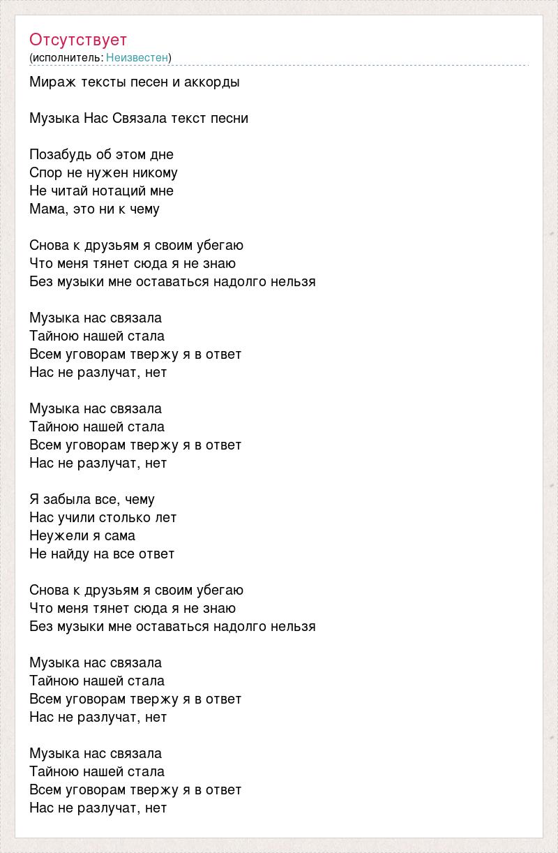Мираж тексты песен и аккорды Музыка Нас Связала текст песни Позабудь об этом дне Спор не нужен никому Не читай нотаций мне Мама, это ни к чему Снова к друзьям я своим убегаю Что меня тянет сюда я не знаю Без музыки мне оставаться надолго нельзя Музыка нас связала Тайною нашей стала Всем уговорам твержу я в ответ Нас не разлучат, нет Музыка нас связала Тайною нашей стала Всем уговорам твержу я в ответ Нас не разлучат, нет Я забыла все, чему Нас учили столько лет Неужели я сама Не найду на все ответ Снова к друзьям я своим убегаю Что меня тянет сюда я не знаю Без музыки мне оставаться надолго нельзя Музыка нас связала Тайною нашей стала Всем уговорам твержу я в ответ Нас не разлучат, нет Музыка нас связала Тайною нашей стала Всем уговорам твержу я в ответ Нас не разлучат, нет