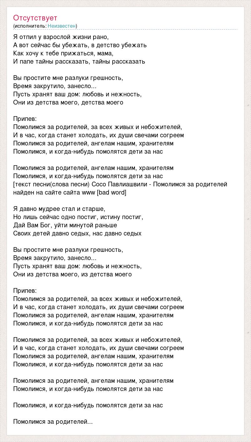 Я отпил у взрослой жизни рано, А вот сейчас бы убежать, в детство убежать Как хочу к тебе прижаться, мама, И папе тайны рассказать, тайны рассказать Вы простите мне разлуки грешность, Время закрутило, занесло... Пусть хранят ваш дом: любовь и нежность, Они из детства моего, детства моего Припев: Помолимся за родителей, за всех живых и небожителей, И в час, когда станет холодать, их души свечами согреем Помолимся за родителей, ангелам нашим, хранителям Помолимся, и когда-нибудь помолятся дети за нас Помолимся за родителей, ангелам нашим, хранителям Помолимся, и когда-нибудь помолятся дети за нас [текст песни(слова песни) Сосо Павлиашвили - Помолимся за родителей найден на сайте сайта www [bad word] Я давно мудрее стал и старше, Но лишь сейчас одно постиг, истину постиг, Дай Вам Бог, уйти минутой раньше Своих детей давно седых, нас давно седых Вы простите мне разлуки грешность, Время закрутило, занесло... Пусть хранят ваш дом: любовь и нежность, Они из детства моего, из детства моего Припев: Помолимся за родителей, за всех живых и небожителей, И в час, когда станет холодать, их души свечами согреем Помолимся за родителей, ангелам нашим, хранителям Помолимся, и когда-нибудь помолятся дети за нас Помолимся за родителей, за всех живых и небожителей, И в час, когда станет холодать, их души свечами согреем Помолимся за родителей, ангелам нашим, хранителям Помолимся, и когда-нибудь помолятся дети за нас Помолимся за родителей, ангелам нашим, хранителям Помолимся, и когда-нибудь помолятся дети за нас Помолимся, и когда-нибудь помолятся дети за нас Помолимся за родителей...
