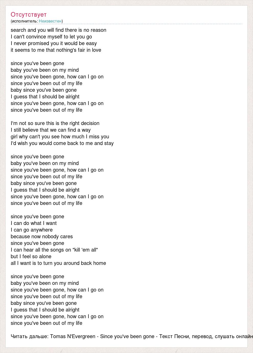 search and you will find there is no reason I can't convince myself to let you go I never promised you it would be easy it seems to me that nothing's fair in love since you've been gone baby you've been on my mind since you've been gone, how can I go on since you've been out of my life baby since you've been gone I guess that I should be alright since you've been gone, how can I go on since you've been out of my life I'm not so sure this is the right decision I still believe that we can find a way girl why can't you see how much I miss you I'd wish you would come back to me and stay since you've been gone baby you've been on my mind since you've been gone, how can I go on since you've been out of my life baby since you've been gone I guess that I should be alright since you've been gone, how can I go on since you've been out of my life since you've been gone I can do what I want I can go anywhere because now nobody cares since you've been gone I can hear all the songs on "kill 'em all" but I feel so alone all I want is to turn you around back home since you've been gone baby you've been on my mind since you've been gone, how can I go on since you've been out of my life baby since you've been gone I guess that I should be alright since you've been gone, how can I go on since you've been out of my life Читать дальше: Tomas N'Evergreen - Since you've been gone - Текст Песни, перевод, слушать онлайн
