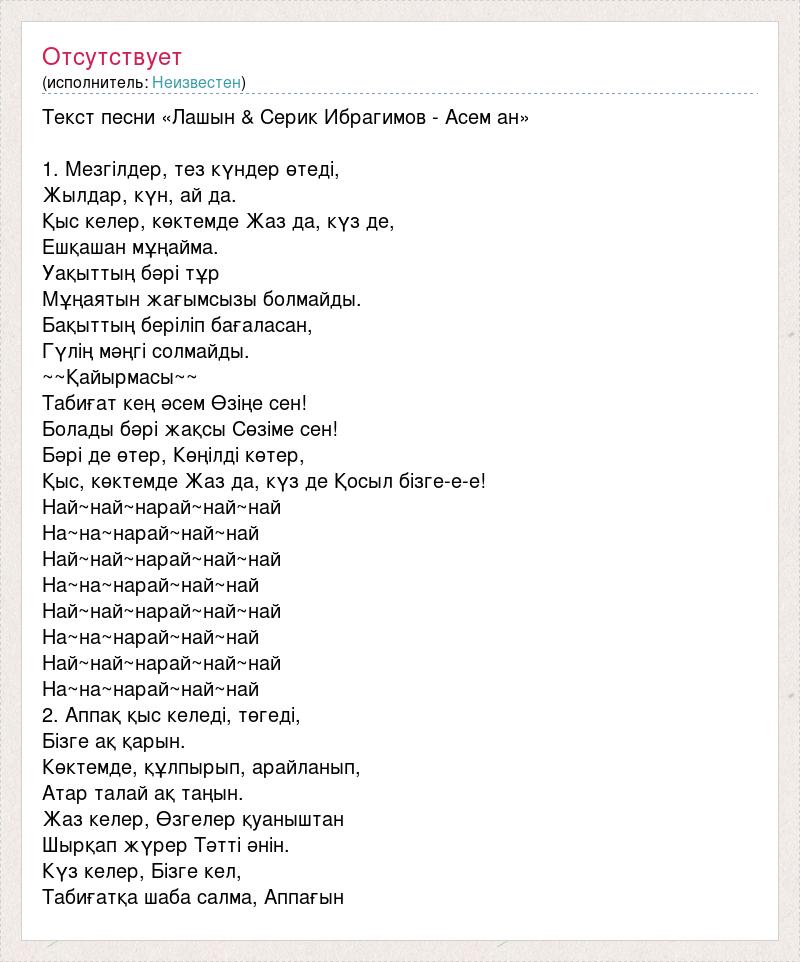 Текст песни «Лашын & Серик Ибрагимов - Асем ан» 1. Мезгілдер, тез күндер өтеді, Жылдар, күн, ай да. Қыс келер, көктемде Жаз да, күз де, Ешқашан мұңайма. Уақыттың бәрі тұр Мұңаятын жағымсызы болмайды. Бақыттың беріліп бағаласан, Гүлің мәңгі солмайды. ~~Қайырмасы~~ Табиғат кең әсем Өзіңе сен! Болады бәрі жақсы Сөзіме сен! Бәрі де өтер, Көңілді көтер, Қыс, көктемде Жаз да, күз де Қосыл бізге-е-е! Най~най~нарай~най~най На~на~нарай~най~най Най~най~нарай~най~най На~на~нарай~най~най Най~най~нарай~най~най На~на~нарай~най~най Най~най~нарай~най~най На~на~нарай~най~най 2. Аппақ қыс келеді, төгеді, Бізге ақ қарын. Көктемде, құлпырып, арайланып, Атар талай ақ таңын. Жаз келер, Өзгелер қуаныштан Шырқап жүрер Тәтті әнін. Күз келер, Бізге кел, Табиғатқа шаба салма, Аппағын