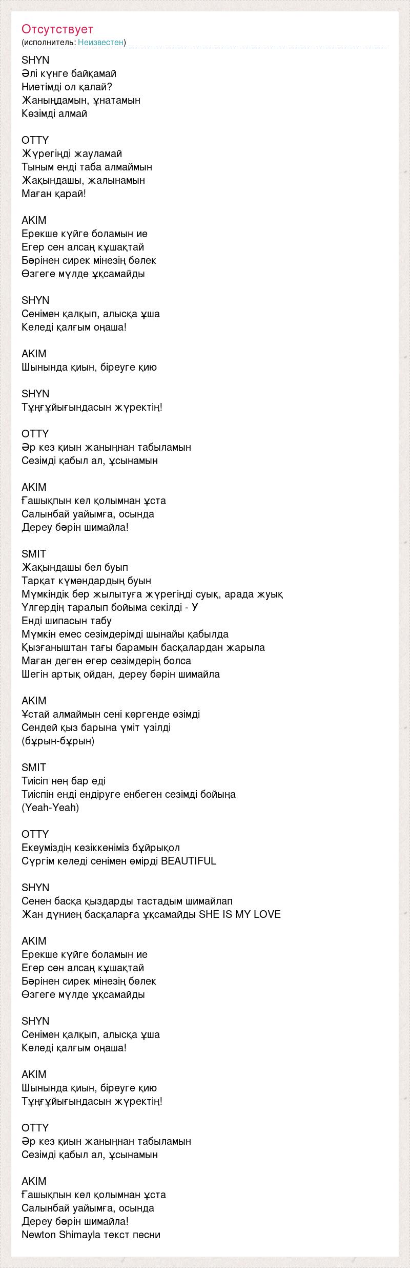 SHYN Əлі күнге байқамай Ниетімді ол қалай? Жаныңдамын, ұнатамын Көзімді алмай OTTY Жүрегіңді жауламай Тыным енді таба алмаймын Жақындашы, жалынамын Маған қарай! AKIM Ерекше күйге боламын ие Егер сен алсаң кұшақтай Бəрінен сирек мінезің бөлек Өзгеге мүлде ұқсамайды SHYN Сенімен қалқып, алысқа ұша Келеді қалғым оңаша! AKIM Шынында қиын, біреуге қию SHYN Тұңғұйығындасын жүректің! OTTY Əр кез қиын жаныңнан табыламын Сезімді қабыл ал, ұсынамын AKIM Ғашықпын кел қолымнан ұста Салынбай уайымға, осында Дереу бəрін шимайла! SMIT Жақындашы бел буып Тарқат күмәндардың буын Мүмкіндік бер жылытуға жүрегіңді суық, арада жуық Үлгердің таралып бойыма секілді - У Енді шипасын табу Мүмкін емес сезімдерімді шынайы қабылда Қызғаныштан тағы барамын басқалардан жарыла Маған деген егер сезімдерің болса Шегін артық ойдан, дереу бәрін шимайла AKIM Ұстай алмаймын сені көргенде өзімді Сендей қыз барына үміт үзілді (бұрын-бұрын) SMIT Тиісіп нең бар еді Тиіспін енді ендіруге енбеген сезімді бойыңа (Yeah-Yeah) OTTY Екеуміздің кезіккеніміз бұйрықол Сүргім келеді сенімен өмірді BEAUTIFUL SHYN Сенен басқа қыздарды тастадым шимайлап Жан дүниең басқаларға ұқсамайды SHE IS MY LOVE AKIM Ерекше күйге боламын ие Егер сен алсаң кұшақтай Бəрінен сирек мінезің бөлек Өзгеге мүлде ұқсамайды SHYN Сенімен қалқып, алысқа ұша Келеді қалғым оңаша! AKIM Шынында қиын, біреуге қию Тұңғұйығындасын жүректің! OTTY Əр кез қиын жаныңнан табыламын Сезімді қабыл ал, ұсынамын AKIM Ғашықпын кел қолымнан ұста Салынбай уайымға, осында Дереу бəрін шимайла! Newton Shimayla текст песни