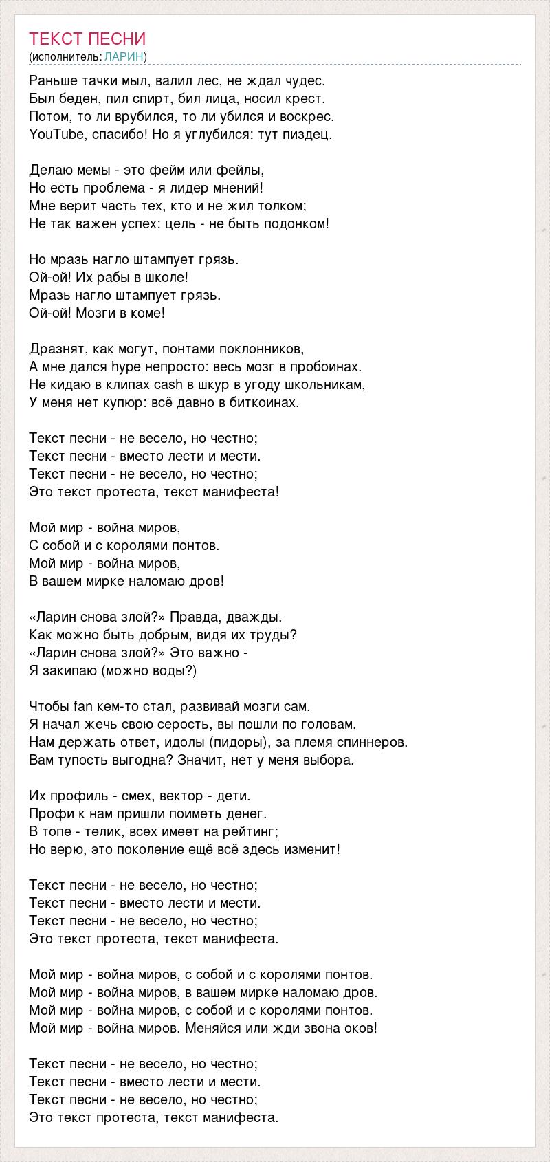 Раньше тачки мыл, валил лес, не ждал чудес. Был беден, пил спирт, бил лица, носил крест. Потом, то ли врубился, то ли убился и воскрес. YouTube, спасибо! Но я углубился: тут пиздец. Делаю мемы - это фейм или фейлы, Но есть проблема - я лидер мнений! Мне верит часть тех, кто и не жил толком; Не так важен успех: цель - не быть подонком! Но мразь нагло штампует грязь. Ой-ой! Их рабы в школе! Мразь нагло штампует грязь. Ой-ой! Мозги в коме! Дразнят, как могут, понтами поклонников, А мне дался hype непросто: весь мозг в пробоинах. Не кидаю в клипах cash в шкур в угоду школьникам, У меня нет купюр: всё давно в биткоинах. Текст песни - не весело, но честно; Текст песни - вместо лести и мести. Текст песни - не весело, но честно; Это текст протеста, текст манифеста! Мой мир - война миров, С собой и с королями понтов. Мой мир - война миров, В вашем мирке наломаю дров! «Ларин снова злой?» Правда, дважды. Как можно быть добрым, видя их труды? «Ларин снова злой?» Это важно - Я закипаю (можно воды?) Чтобы fan кем-то стал, развивай мозги сам. Я начал жечь свою серость, вы пошли по головам. Нам держать ответ, идолы (пидоры), за племя спиннеров. Вам тупость выгодна? Значит, нет у меня выбора. Их профиль - смех, вектор - дети. Профи к нам пришли поиметь денег. В топе - телик, всех имеет на рейтинг; Но верю, это поколение ещё всё здесь изменит! Текст песни - не весело, но честно; Текст песни - вместо лести и мести. Текст песни - не весело, но честно; Это текст протеста, текст манифеста. Мой мир - война миров, с собой и с королями понтов. Мой мир - война миров, в вашем мирке наломаю дров. Мой мир - война миров, с собой и с королями понтов. Мой мир - война миров. Меняйся или жди звона оков! Текст песни - не весело, но честно; Текст песни - вместо лести и мести. Текст песни - не весело, но честно; Это текст протеста, текст манифеста.