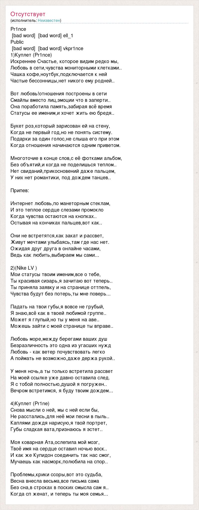 Pr1nce [bad word] [bad word] ell_1 Public [bad word] [bad word] vkpr1nce 1)Куплет (Pr1nce) Искреннее Счастье, которое видим редко мы, Любовь в сети,чувства мониторными клетками.. Чашка кофе,ноутбук,подключается к ней Частые бессонницы,нет никого ему родней.. Вот любовь!отношения построены в сети Смайлы вместо лиц,эмоции что в заперти.. Она поработила память,забирая всё время Статусы ее именим,и хочет жить ею бредя.. Букет роз,который зарисован ей на стену, Когда не первый год,но не понять систему. Подарки за один голос,не слыша его при этом Когда отношения начинаются одним приветом. Многоточие в конце слов,с её фотками альбом, Без объятий,и когда не поделишься теплом.. Нет свиданий,прикосновений даже пальцем, У них нет романтики, под дождем танцев.. Припев: Интернет любовь,по манеторным стеклам, И это теплое сердце слезами промокло Когда чувства остаются на кнопках.. Остывая на кончиках пальцев,вот как.. Они не встретятся,как закат и рассвет, Живут мечтами улыбаясь,там где нас нет. Ожидая друг друга в онлайне часами, Ведь как любить,выбираем мы сами... 2)(Nike LV ) Мои статусы твоим именим,все о тебе, Ты красивая сизарь,я зачитаю вот теперь.. Ты приняла заявку и на странице оттпель, Чувства будут без потерь,ты мне поверь... Падать на твои губы,я вовсе не грубый, Я знаю,всё как в твоей любимой группе.. Может я глупый,но ты у меня на аве.. Можешь зайти с моей странице ты вправе.. Любовь море,между берегами ваших душ Безразличность это одна из угасших нужд Любовь - как ветер почувствовать легко А поймать не возможно,даже держа рукой.. У меня ночь,а ты только встретила рассвет На моей ссылке уже давно оставила след. Я с тобой полностью,душой я погружен.. Вечром встретимся, я буду твоим дождем... 4)Куплет (Pr1ne) Снова мысли о ней, мы с ней если бы, Не расстались,для неё мои песни в пыль.. Каплями дождя нарисую,я твой портрет, Губы сладкая вата,признаюсь я эстет.. Моя коварная Ата,ослепила мой мозг, Твоё имя на сердце оставил ночью воск.. И как же Купидон соединить так нас смог, Мучаешь как насморк,полюбила на спор.. Проблемы,крики ссоры,вот это судьба, Весна внесла весьма,все письма сама Без сна,в строках в поских смысла сам я.. Когда сп женат, и теперь ты моя семья...