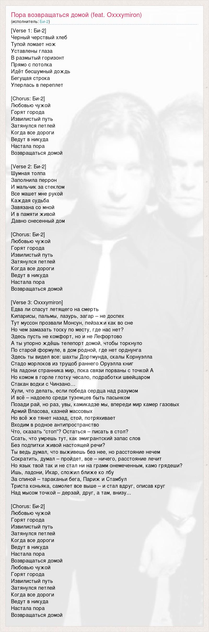 [Verse 1: Би-2] Черный черствый хлеб Тупой ломает нож Уставлены глаза В размытый горизонт Прямо с потолка Идёт бесшумный дождь Бегущая строка Уперлась в переплет [Chorus: Би-2] Любовью чужой Горят города Извилистый путь Затянулся петлей Когда все дороги Ведут в никуда Настала пора Возвращаться домой [Verse 2: Би-2] Шумная толпа Заполнила перрон И мальчик за стеклом Все машет мне рукой Каждая судьба Завязана со мной И в памяти живой Давно снесенный дом [Chorus: Би-2] Любовью чужой Горят города Извилистый путь Затянулся петлей Когда все дороги Ведут в никуда Настала пора Возвращаться домой [Verse 3: Oxxxymiron] Едва ли спасут летящего на смерть Кипарисы, пальмы, лазурь, загар – не доспех Тут муссон прозвали Монсун, пейзажи как во сне Но чем замазать тоску по месту, где нас нет? Здесь пусть не комфорт, но и не Лефортово А ты упорно ждёшь телепорт домой, чтобы торкнуло По старой формуле, в дом родной, где нет орднунга Здесь ты видел все: шахты Дортмунда, скалы Корнуэлла Стадо морлоков из трущоб раннего Оруэлла книг На ладони странника мир, пока связи порваны с точкой А Но комом в горле глотку чесало, подработки швейцаром Стакан водки с Чинзано… Хули, что делать, если победа сердца над разумом И всё – надоело среди туземцев быть пасынком Позади рай, но раз, увы, камикадзе мы, впереди мир камер газовых Армий Власова, казней массовых Но всё же тянет назад, стой, потряхивает Входим в родное антипространство Что, сказать “стоп”? Остаться – писать в стол? Ссать, что умрешь тут, как эмигрантский запас слов Без подпитки живой настоящей речи? Ты ведь думал, что выживешь без нее, но расстояние нечем Сократить, думал – пройдет, все – ничего, расстояние лечит Но язык твой так и не стал ни на грамм онемеченным, камо грядеши? Ишь, ладони, Икар, сложил ближе ко лбу За спиной – тараканьи бега, Париж и Стамбул Триста коньяка, самолет все выше – и стал вдруг, описав круг Над мысом точкой – дерзай, друг, а там, внизу... [Chorus: Би-2] Любовью чужой Горят города Извилистый путь Затянулся петлей Когда все дороги Ведут в никуда Настала пора Возвращаться домой Любовью чужой Горят города Извилистый путь Затянулся петлей Когда все дороги Ведут в никуда Настала пора Возвращаться домой
