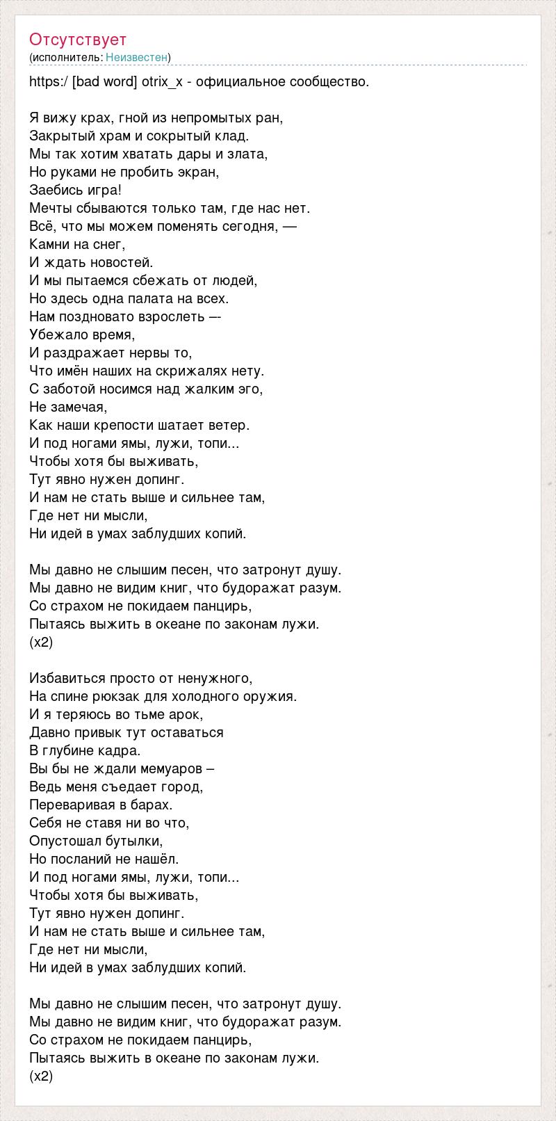https:/ [bad word] otrix_x - официальное сообщество. Я вижу крах, гной из непромытых ран, Закрытый храм и сокрытый клад. Мы так хотим хватать дары и злата, Но руками не пробить экран, Заебись игра! Мечты сбываются только там, где нас нет. Всё, что мы можем поменять сегодня, — Камни на снег, И ждать новостей. И мы пытаемся сбежать от людей, Но здесь одна палата на всех. Нам поздновато взрослеть –- Убежало время, И раздражает нервы то, Что имён наших на скрижалях нету. С заботой носимся над жалким эго, Не замечая, Как наши крепости шатает ветер. И под ногами ямы, лужи, топи... Чтобы хотя бы выживать, Тут явно нужен допинг. И нам не стать выше и сильнее там, Где нет ни мысли, Ни идей в умах заблудших копий. Мы давно не слышим песен, что затронут душу. Мы давно не видим книг, что будоражат разум. Со страхом не покидаем панцирь, Пытаясь выжить в океане по законам лужи. (x2) Избавиться просто от ненужного, На спине рюкзак для холодного оружия. И я теряюсь во тьме арок, Давно привык тут оставаться В глубине кадра. Вы бы не ждали мемуаров – Ведь меня съедает город, Переваривая в барах. Себя не ставя ни во что, Опустошал бутылки, Но посланий не нашёл. И под ногами ямы, лужи, топи... Чтобы хотя бы выживать, Тут явно нужен допинг. И нам не стать выше и сильнее там, Где нет ни мысли, Ни идей в умах заблудших копий. Мы давно не слышим песен, что затронут душу. Мы давно не видим книг, что будоражат разум. Со страхом не покидаем панцирь, Пытаясь выжить в океане по законам лужи. (x2)