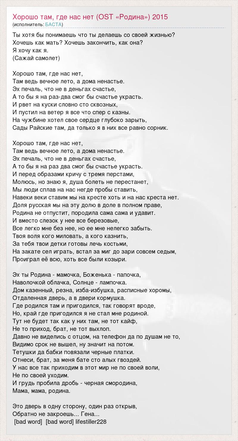 Ты хотя бы понимаешь что ты делаешь со своей жизнью? Хочешь как мать? Хочешь закончить, как она? Я хочу как я. (Сажай самолет) Хорошо там, где нас нет, Там ведь вечное лето, а дома ненастье. Эх печаль, что не в деньгах счастье, А то бы я на раз-два смог бы счастье украсть. И рвет на куски словно сто сквозных, И пустил на ветер я все что спер с казны. На чужбине хотел свое сердце глубоко зарыть, Сады Райские там, да только я в них все равно сорник. Хорошо там, где нас нет, Там ведь вечное лето, а дома ненастье. Эх печаль, что не в деньгах счастье, А то бы я на раз два смог бы счастье украсть. И перед образами кричу с тремя перстами, Молюсь, но знаю я, душа болеть не перестанет, Мы люди сплав на нас негде пробы ставить, Навеки веки ставим мы на кресте хоть и на нас креста нет. Доля русская мы на эту долю в доле в полном праве, Родина не отпустит, породила сама сама и удавит. И вместо слезок у нее все березовые, Все легко мне без нее, но ее мне нелегко забыть. Твоя воля кого миловать, а кого казнить, За тебя твои детки готовы лечь костьми, На закате сел играть, встал за миг до зари совсем седым, Проиграл её всю, хоть все были козыри. Эх ты Родина - мамочка, Боженька - папочка, Наволочкой облачка, Солнце - лампочка. Дом казенный, резна, изба-избушка, расписные хоромы, Отдаленная дверь, а в двери кормушка. Где родился там и пригодился, так говорят вроде, Но, край где пригодился я не стал мне родиной. Тут не будет так как у них там, не тот кайф, Не то приход, брат, не тот выхлоп. Давно не виделись с отцом, на телефон да по душам не то, Видимо срок не вышел, ну значит на потом. Тетушки да бабки повязали черные платки. Отнеси, брат, за меня бате сто алых гвоздей. У нас все так приходим в этот мир не по своей воли, Не по своей уходим. И грудь пробила дробь - черная смородина, Мама, мама, родина. Это дверь в одну сторону, один раз открыв, Обратно не закроешь... Гена... [bad word] [bad word] lifestiller228
