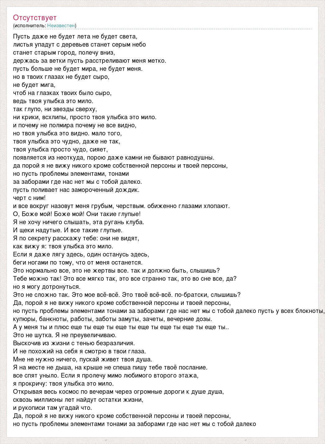 Пусть даже не будет лета не будет света, листья упадут с деревьев станет серым небо станет старым город, полечу вниз, держась за ветки пусть расстреливают меня метко. пусть больше не будет мира, не будет меня. но в твоих глазах не будет сыро, не будет мига, чтоб на глазках твоих было сыро, ведь твоя улыбка это мило. так глупо, ни звезды сверху, ни крики, всхлипы, просто твоя улыбка это мило. и почему не полмира почему не все видно, но твоя улыбка это видно. мало того, твоя улыбка это чудно, даже не так, твоя улыбка просто чудо, сияет, появляется из неоткуда, порою даже камни не бывают равнодушны. да порой я не вижу никого кроме собственной персоны и твоей персоны, но пусть проблемы элементами, тонами за заборами где нас нет мы с тобой далеко. пусть поливает нас замороченный дождик. черт с ним! и все вокруг назовут меня грубым, черствым. обиженно глазами хлопают. О, Боже мой! Боже мой! Они такие глупые! Я не хочу ничего слышать, эта ругань клуба. И щеки надутые. И все такие глупые. Я по секрету расскажу тебе: они не видят, как вижу я: твоя улыбка это мило. Если я даже лягу здесь, один останусь здесь, беги ногами по тому, что от меня останется. Это нормально все, это не жертвы все. так и должно быть, слышишь? Тебе можно так! Это все мягко так, это все странно так, это во сне все, да? но я могу дотронуться. Это не сложно так. Это мое всё-всё. Это твоё всё-всё. по-братски, слышишь? Да, порой я не вижу никого кроме собственной персоны и твоей персоны, но пусть проблемы элементами тонами за заборами где нас нет мы с тобой далеко пусть у всех блокноты, купюры, банкноты, работы, заботы замуты, зачеты, вечерние дозы. А у меня ты и плюс еще ты еще ты еще ты еще ты еще ты еще ты еще ты.. Это не шутка. Я не преувеличиваю. Выскочив из жизни с тенью безразличия. И не похожий на себя я смотрю в твои глаза. Мне не нужно ничего, пускай живет твоя душа. Я на месте не дыша, на крыше не спеша пишу тебе твоё послание. все спят уныло. Если я пролечу мимо любимого второго этажа, я прокричу: твоя улыбка это мило. Открывая весь космос по вечерам через огромные дороги к душе душа, сквозь миллионы лет найдут остатки жизни, и рукописи там угадай что. Да, порой я не вижу никого кроме собственной персоны и твоей персоны, но пусть проблемы элементами тонами за заборами где нас нет мы с тобой далеко