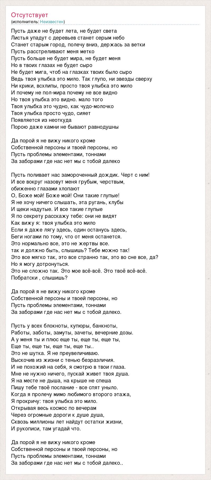 Пусть даже не будет лета, не будет света Листья упадут с деревьев станет серым небо Станет старым город, полечу вниз, держась за ветки Пусть расстреливают меня метко Пусть больше не будет мира, не будет меня Но в твоих глазах не будет сыро Не будет мига, чтоб на глазках твоих было сыро Ведь твоя улыбка это мило. Так глупо, ни звезды сверху Ни крики, всхлипы, просто твоя улыбка это мило И почему не пол-мира почему не все видно Но твоя улыбка это видно. мало того Твоя улыбка это чудно, как чудо-молочко Твоя улыбка просто чудо, сияет Появляется из неоткуда Порою даже камни не бывают равнодушны Да порой я не вижу никого кроме Собственной персоны и твоей персоны, но Пусть проблемы элементами, тоннами За заборами где нас нет мы с тобой далеко Пусть поливает нас замороченный дождик. Черт с ним! И все вокруг назовут меня грубым, черствым, обиженно глазами хлопают О, Боже мой! Боже мой! Они такие глупые! Я не хочу ничего слышать, эта ругань, клубы И щеки надутые. И все такие глупые Я по секрету расскажу тебе: они не видят Как вижу я: твоя улыбка это мило Если я даже лягу здесь, один останусь здесь, Беги ногами по тому, что от меня останется. Это нормально все, это не жертвы все. так и должно быть, слышишь? Тебе можно так! Это все мягко так, это все странно так, это во сне все, да? Но я могу дотронуться. Это не сложно так. Это мое всё-всё. Это твоё всё-всё. Побратски , слышишь? Да порой я не вижу никого кроме Собственной персоны и твоей персоны, но Пусть проблемы элементами, тоннами За заборами где нас нет мы с тобой далеко. Пусть у всех блокноты, купюры, банкноты, Работы, заботы, замуты, зачеты, вечерние дозы. А у меня ты и плюс еще ты, еще ты, еще ты, Еще ты, еще ты, еще ты, еще ты.. Это не шутка. Я не преувеличиваю. Выскочив из жизни с тенью безразличия. И не похожий на себя, я смотрю в твои глаза. Мне не нужно ничего, пускай живет твоя душа. Я на месте не дыша, на крыше не спеша Пишу тебе твоё послание - все спят уныло. Когда я пролечу мимо любимого второго этажа, Я прокричу: твоя улыбка это мило. Открывая весь космос по вечерам Через огромные дороги к душе душа, Сквозь миллионы лет найдут остатки жизни, И рукописи, там угадай что. Да порой я не вижу никого кроме Собственной персоны и твоей персоны, но Пусть проблемы элементами, тоннами За заборами где нас нет мы с тобой далеко..