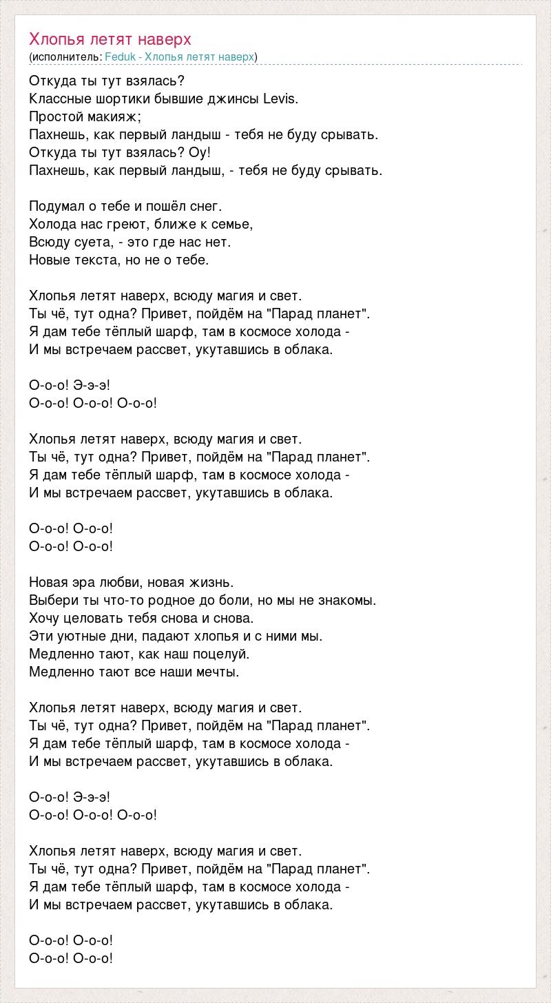 Откуда ты тут взялась? Классные шортики бывшие джинсы Levis. Простой макияж; Пахнешь, как первый ландыш - тебя не буду срывать. Откуда ты тут взялась? Оу! Пахнешь, как первый ландыш, - тебя не буду срывать. Подумал о тебе и пошёл снег. Холода нас греют, ближе к семье, Всюду суета, - это где нас нет. Новые текста, но не о тебе. Хлопья летят наверх, всюду магия и свет. Ты чё, тут одна? Привет, пойдём на "Парад планет". Я дам тебе тёплый шарф, там в космосе холода - И мы встречаем рассвет, укутавшись в облака. О-о-о! Э-э-э! О-о-о! О-о-о! О-о-о! Хлопья летят наверх, всюду магия и свет. Ты чё, тут одна? Привет, пойдём на "Парад планет". Я дам тебе тёплый шарф, там в космосе холода - И мы встречаем рассвет, укутавшись в облака. О-о-о! О-о-о! О-о-о! О-о-о! Новая эра любви, новая жизнь. Выбери ты что-то родное до боли, но мы не знакомы. Хочу целовать тебя снова и снова. Эти уютные дни, падают хлопья и с ними мы. Медленно тают, как наш поцелуй. Медленно тают все наши мечты. Хлопья летят наверх, всюду магия и свет. Ты чё, тут одна? Привет, пойдём на "Парад планет". Я дам тебе тёплый шарф, там в космосе холода - И мы встречаем рассвет, укутавшись в облака. О-о-о! Э-э-э! О-о-о! О-о-о! О-о-о! Хлопья летят наверх, всюду магия и свет. Ты чё, тут одна? Привет, пойдём на "Парад планет". Я дам тебе тёплый шарф, там в космосе холода - И мы встречаем рассвет, укутавшись в облака. О-о-о! О-о-о! О-о-о! О-о-о!