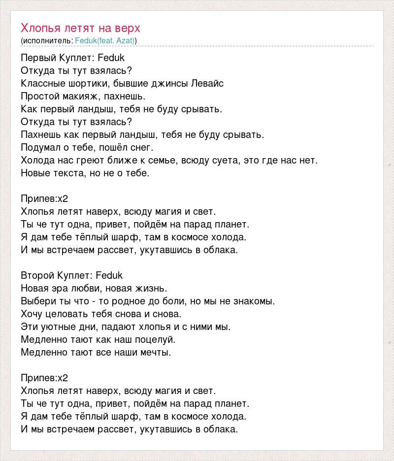 Первый Куплет: Feduk Откуда ты тут взялась? Классные шортики, бывшие джинсы Левайс Простой макияж, пахнешь. Как первый ландыш, тебя не буду срывать. Откуда ты тут взялась? Пахнешь как первый ландыш, тебя не буду срывать. Подумал о тебе, пошёл снег. Холода нас греют ближе к семье, всюду суета, это где нас нет. Новые текста, но не о тебе. Припев:х2 Хлопья летят наверх, всюду магия и свет. Ты че тут одна, привет, пойдём на парад планет. Я дам тебе тёплый шарф, там в космосе холода. И мы встречаем рассвет, укутавшись в облака. Второй Куплет: Feduk Новая эра любви, новая жизнь. Выбери ты что - то родное до боли, но мы не знакомы. Хочу целовать тебя снова и снова. Эти уютные дни, падают хлопья и с ними мы. Медленно тают как наш поцелуй. Медленно тают все наши мечты. Припев:х2 Хлопья летят наверх, всюду магия и свет. Ты че тут одна, привет, пойдём на парад планет. Я дам тебе тёплый шарф, там в космосе холода. И мы встречаем рассвет, укутавшись в облака.