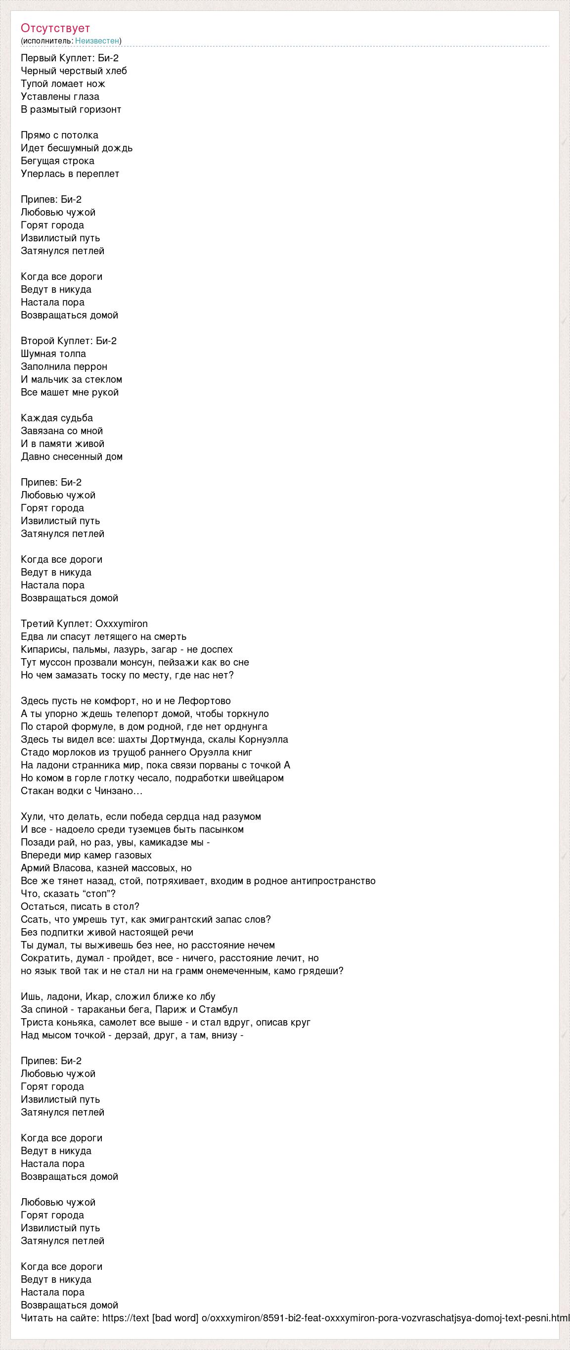 Первый Куплет: Би-2 Черный черствый хлеб Тупой ломает нож Уставлены глаза В размытый горизонт Прямо с потолка Идет бесшумный дождь Бегущая строка Уперлась в переплет Припев: Би-2 Любовью чужой Горят города Извилистый путь Затянулся петлей Когда все дороги Ведут в никуда Настала пора Возвращаться домой Второй Куплет: Би-2 Шумная толпа Заполнила перрон И мальчик за стеклом Все машет мне рукой Каждая судьба Завязана со мной И в памяти живой Давно снесенный дом Припев: Би-2 Любовью чужой Горят города Извилистый путь Затянулся петлей Когда все дороги Ведут в никуда Настала пора Возвращаться домой Третий Куплет: Oxxxymiron Едва ли спасут летящего на смерть Кипарисы, пальмы, лазурь, загар - не доспех Тут муссон прозвали монсун, пейзажи как во сне Но чем замазать тоску по месту, где нас нет? Здесь пусть не комфорт, но и не Лефортово А ты упорно ждешь телепорт домой, чтобы торкнуло По старой формуле, в дом родной, где нет орднунга Здесь ты видел все: шахты Дортмунда, скалы Корнуэлла Стадо морлоков из трущоб раннего Оруэлла книг На ладони странника мир, пока связи порваны с точкой А Но комом в горле глотку чесало, подработки швейцаром Стакан водки с Чинзано… Хули, что делать, если победа сердца над разумом И все - надоело среди туземцев быть пасынком Позади рай, но раз, увы, камикадзе мы - Впереди мир камер газовых Армий Власова, казней массовых, но Все же тянет назад, стой, потряхивает, входим в родное антипространство Что, сказать “стоп”? Остаться, писать в стол? Ссать, что умрешь тут, как эмигрантский запас слов? Без подпитки живой настоящей речи Ты думал, ты выживешь без нее, но расстояние нечем Сократить, думал - пройдет, все - ничего, расстояние лечит, но но язык твой так и не стал ни на грамм онемеченным, камо грядеши? Ишь, ладони, Икар, сложил ближе ко лбу За спиной - тараканьи бега, Париж и Стамбул Триста коньяка, самолет все выше - и стал вдруг, описав круг Над мысом точкой - дерзай, друг, а там, внизу - Припев: Би-2 Любовью чужой Горят города Извилистый путь Затянулся петлей Когда все дороги Ведут в никуда Настала пора Возвращаться домой Любовью чужой Горят города Извилистый путь Затянулся петлей Когда все дороги Ведут в никуда Настала пора Возвращаться домой Читать на сайте: https://text [bad word] o/oxxxymiron/8591-bi2-feat-oxxxymiron-pora-vozvraschatjsya-domoj-text-pesni.html