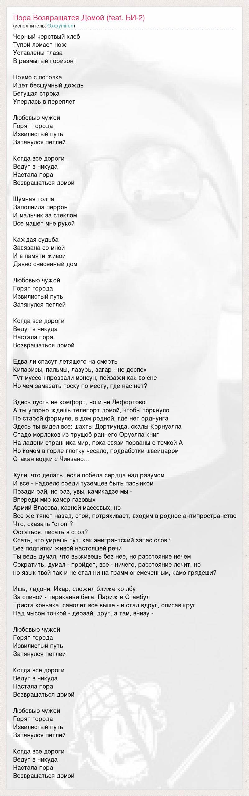Черный черствый хлеб Тупой ломает нож Уставлены глаза В размытый горизонт Прямо с потолка Идет бесшумный дождь Бегущая строка Уперлась в переплет Любовью чужой Горят города Извилистый путь Затянулся петлей Когда все дороги Ведут в никуда Настала пора Возвращаться домой Шумная толпа Заполнила перрон И мальчик за стеклом Все машет мне рукой Каждая судьба Завязана со мной И в памяти живой Давно снесенный дом Любовью чужой Горят города Извилистый путь Затянулся петлей Когда все дороги Ведут в никуда Настала пора Возвращаться домой Едва ли спасут летящего на смерть Кипарисы, пальмы, лазурь, загар - не доспех Тут муссон прозвали монсун, пейзажи как во сне Но чем замазать тоску по месту, где нас нет? Здесь пусть не комфорт, но и не Лефортово А ты упорно ждешь телепорт домой, чтобы торкнуло По старой формуле, в дом родной, где нет орднунга Здесь ты видел все: шахты Дортмунда, скалы Корнуэлла Стадо морлоков из трущоб раннего Оруэлла книг На ладони странника мир, пока связи порваны с точкой А Но комом в горле глотку чесало, подработки швейцаром Стакан водки с Чинзано… Хули, что делать, если победа сердца над разумом И все - надоело среди туземцев быть пасынком Позади рай, но раз, увы, камикадзе мы - Впереди мир камер газовых Армий Власова, казней массовых, но Все же тянет назад, стой, потряхивает, входим в родное антипространство Что, сказать “стоп”? Остаться, писать в стол? Ссать, что умрешь тут, как эмигрантский запас слов? Без подпитки живой настоящей речи Ты ведь думал, что выживешь без нее, но расстояние нечем Сократить, думал - пройдет, все - ничего, расстояние лечит, но но язык твой так и не стал ни на грамм онемеченным, камо грядеши? Ишь, ладони, Икар, сложил ближе ко лбу За спиной - тараканьи бега, Париж и Стамбул Триста коньяка, самолет все выше - и стал вдруг, описав круг Над мысом точкой - дерзай, друг, а там, внизу - Любовью чужой Горят города Извилистый путь Затянулся петлей Когда все дороги Ведут в никуда Настала пора Возвращаться домой Любовью чужой Горят города Извилистый путь Затянулся петлей Когда все дороги Ведут в никуда Настала пора Возвращаться домой