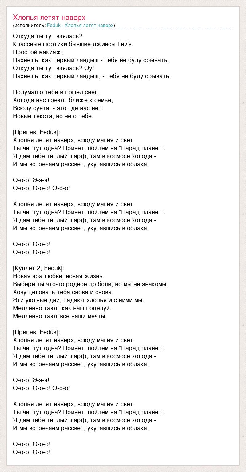 Откуда ты тут взялась? Классные шортики бывшие джинсы Levis. Простой макияж; Пахнешь, как первый ландыш - тебя не буду срывать. Откуда ты тут взялась? Оу! Пахнешь, как первый ландыш, - тебя не буду срывать. Подумал о тебе и пошёл снег. Холода нас греют, ближе к семье, Всюду суета, - это где нас нет. Новые текста, но не о тебе. [Припев, Feduk]: Хлопья летят наверх, всюду магия и свет. Ты чё, тут одна? Привет, пойдём на "Парад планет". Я дам тебе тёплый шарф, там в космосе холода - И мы встречаем рассвет, укутавшись в облака. О-о-о! Э-э-э! О-о-о! О-о-о! О-о-о! Хлопья летят наверх, всюду магия и свет. Ты чё, тут одна? Привет, пойдём на "Парад планет". Я дам тебе тёплый шарф, там в космосе холода - И мы встречаем рассвет, укутавшись в облака. О-о-о! О-о-о! О-о-о! О-о-о! [Куплет 2, Feduk]: Новая эра любви, новая жизнь. Выбери ты что-то родное до боли, но мы не знакомы. Хочу целовать тебя снова и снова. Эти уютные дни, падают хлопья и с ними мы. Медленно тают, как наш поцелуй. Медленно тают все наши мечты. [Припев, Feduk]: Хлопья летят наверх, всюду магия и свет. Ты чё, тут одна? Привет, пойдём на "Парад планет". Я дам тебе тёплый шарф, там в космосе холода - И мы встречаем рассвет, укутавшись в облака. О-о-о! Э-э-э! О-о-о! О-о-о! О-о-о! Хлопья летят наверх, всюду магия и свет. Ты чё, тут одна? Привет, пойдём на "Парад планет". Я дам тебе тёплый шарф, там в космосе холода - И мы встречаем рассвет, укутавшись в облака. О-о-о! О-о-о! О-о-о! О-о-о!