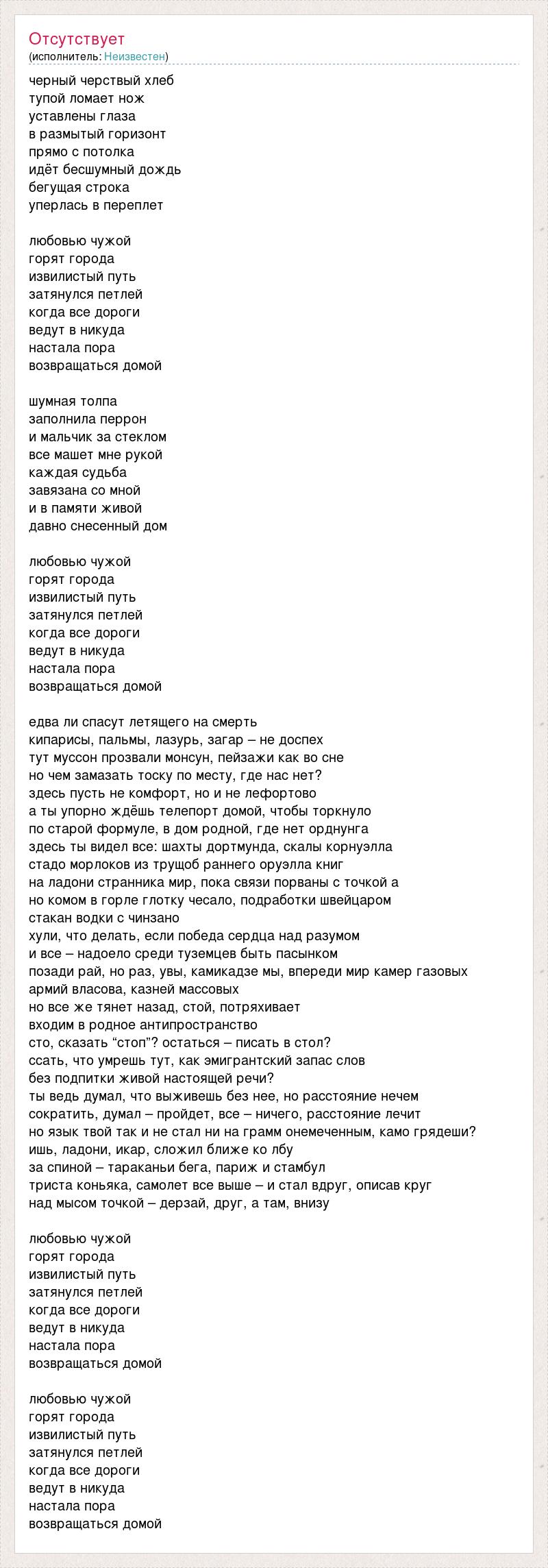 черный черствый хлеб тупой ломает нож уставлены глаза в размытый горизонт прямо с потолка идёт бесшумный дождь бегущая строка уперлась в переплет любовью чужой горят города извилистый путь затянулся петлей когда все дороги ведут в никуда настала пора возвращаться домой шумная толпа заполнила перрон и мальчик за стеклом все машет мне рукой каждая судьба завязана со мной и в памяти живой давно снесенный дом любовью чужой горят города извилистый путь затянулся петлей когда все дороги ведут в никуда настала пора возвращаться домой едва ли спасут летящего на смерть кипарисы, пальмы, лазурь, загар – не доспех тут муссон прозвали монсун, пейзажи как во сне но чем замазать тоску по месту, где нас нет? здесь пусть не комфорт, но и не лефортово а ты упорно ждёшь телепорт домой, чтобы торкнуло по старой формуле, в дом родной, где нет орднунга здесь ты видел все: шахты дортмунда, скалы корнуэлла стадо морлоков из трущоб раннего оруэлла книг на ладони странника мир, пока связи порваны с точкой а но комом в горле глотку чесало, подработки швейцаром стакан водки с чинзано хули, что делать, если победа сердца над разумом и все – надоело среди туземцев быть пасынком позади рай, но раз, увы, камикадзе мы, впереди мир камер газовых армий власова, казней массовых но все же тянет назад, стой, потряхивает входим в родное антипространство сто, сказать “стоп”? остаться – писать в стол? ссать, что умрешь тут, как эмигрантский запас слов без подпитки живой настоящей речи? ты ведь думал, что выживешь без нее, но расстояние нечем сократить, думал – пройдет, все – ничего, расстояние лечит но язык твой так и не стал ни на грамм онемеченным, камо грядеши? ишь, ладони, икар, сложил ближе ко лбу за спиной – тараканьи бега, париж и стамбул триста коньяка, самолет все выше – и стал вдруг, описав круг над мысом точкой – дерзай, друг, а там, внизу любовью чужой горят города извилистый путь затянулся петлей когда все дороги ведут в никуда настала пора возвращаться домой любовью чужой горят города извилистый путь затянулся петлей когда все дороги ведут в никуда настала пора возвращаться домой