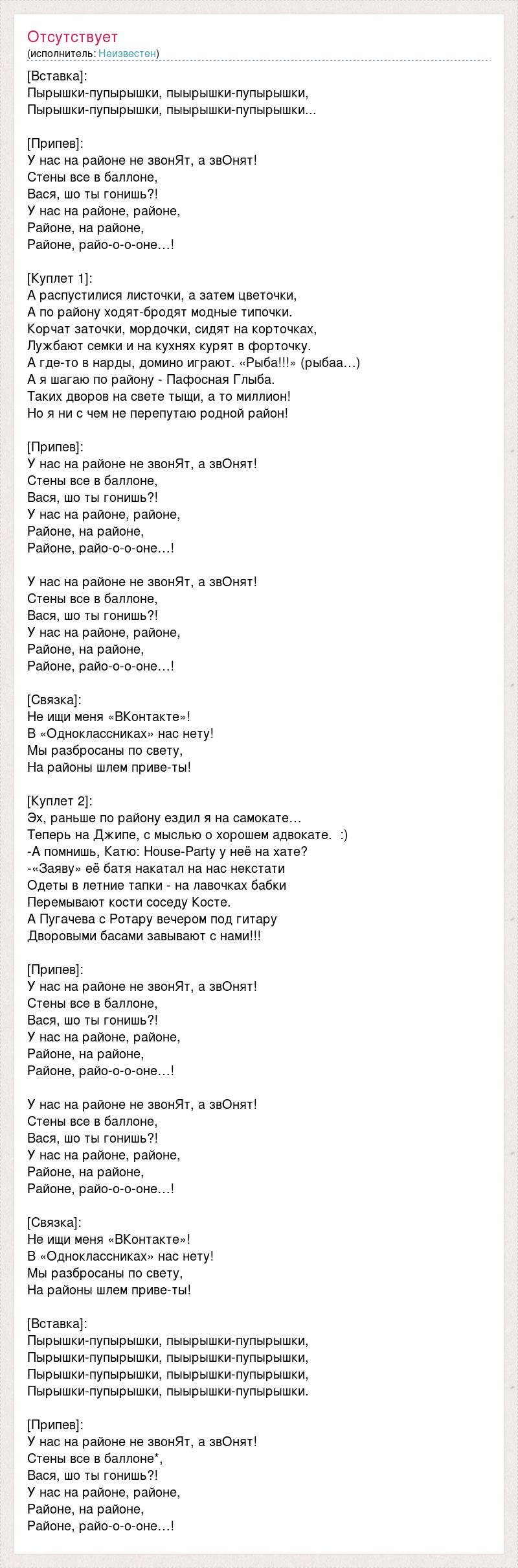 [Вставка]: Пырышки-пупырышки, пыырышки-пупырышки, Пырышки-пупырышки, пыырышки-пупырышки... [Припев]: У нас на районе не звонЯт, а звОнят! Стены все в баллоне, Вася, шо ты гонишь?! У нас на районе, районе, Районе, на районе, Районе, райо-о-о-оне…! [Куплет 1]: А распустилися листочки, а затем цветочки, А по району ходят-бродят модные типочки. Корчат заточки, мордочки, сидят на корточках, Лужбают семки и на кухнях курят в форточку. А где-то в нарды, домино играют. «Рыба!!!» (рыбаа…) А я шагаю по району - Пафосная Глыба. Таких дворов на свете тыщи, а то миллион! Но я ни с чем не перепутаю родной район! [Припев]: У нас на районе не звонЯт, а звОнят! Стены все в баллоне, Вася, шо ты гонишь?! У нас на районе, районе, Районе, на районе, Районе, райо-о-о-оне…! У нас на районе не звонЯт, а звОнят! Стены все в баллоне, Вася, шо ты гонишь?! У нас на районе, районе, Районе, на районе, Районе, райо-о-о-оне…! [Связка]: Не ищи меня «ВКонтакте»! В «Одноклассниках» нас нету! Мы разбросаны по свету, На районы шлем приве-ты! [Куплет 2]: Эх, раньше по району ездил я на самокате… Теперь на Джипе, с мыслью о хорошем адвокате. :) -А помнишь, Катю: House-Party у неё на хате? -«Заяву» её батя накатал на нас некстати Одеты в летние тапки - на лавочках бабки Перемывают кости соседу Косте. А Пугачева с Ротару вечером под гитару Дворовыми басами завывают с нами!!! [Припев]: У нас на районе не звонЯт, а звОнят! Стены все в баллоне, Вася, шо ты гонишь?! У нас на районе, районе, Районе, на районе, Районе, райо-о-о-оне…! У нас на районе не звонЯт, а звОнят! Стены все в баллоне, Вася, шо ты гонишь?! У нас на районе, районе, Районе, на районе, Районе, райо-о-о-оне…! [Связка]: Не ищи меня «ВКонтакте»! В «Одноклассниках» нас нету! Мы разбросаны по свету, На районы шлем приве-ты! [Вставка]: Пырышки-пупырышки, пыырышки-пупырышки, Пырышки-пупырышки, пыырышки-пупырышки, Пырышки-пупырышки, пыырышки-пупырышки, Пырышки-пупырышки, пыырышки-пупырышки. [Припев]: У нас на районе не звонЯт, а звОнят! Стены все в баллоне*, Вася, шо ты гонишь?! У нас на районе, районе, Районе, на районе, Районе, райо-о-о-оне…!