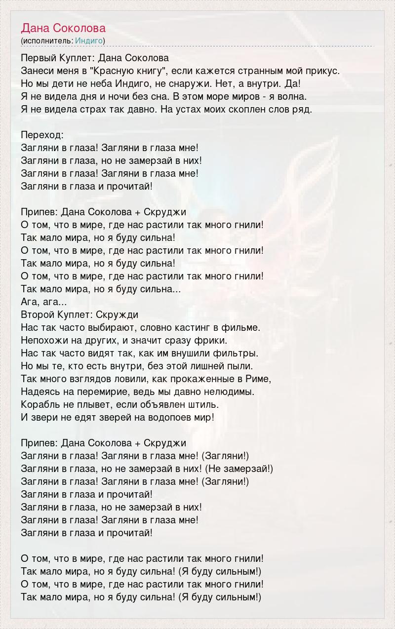 Первый Куплет: Дана Соколова Занеси меня в "Красную книгу", если кажется странным мой прикус. Но мы дети не неба Индиго, не снаружи. Нет, а внутри. Да! Я не видела дня и ночи без сна. В этом море миров - я волна. Я не видела страх так давно. На устах моих скоплен слов ряд. Переход: Загляни в глаза! Загляни в глаза мне! Загляни в глаза, но не замерзай в них! Загляни в глаза! Загляни в глаза мне! Загляни в глаза и прочитай! Припев: Дана Соколова + Скруджи О том, что в мире, где нас растили так много гнили! Так мало мира, но я буду сильна! О том, что в мире, где нас растили так много гнили! Так мало мира, но я буду сильна! О том, что в мире, где нас растили так много гнили! Так мало мира, но я буду сильна... Ага, ага... Второй Куплет: Скружди Нас так часто выбирают, словно кастинг в фильме. Непохожи на других, и значит сразу фрики. Нас так часто видят так, как им внушили фильтры. Но мы те, кто есть внутри, без этой лишней пыли. Так много взглядов ловили, как прокаженные в Риме, Надеясь на перемирие, ведь мы давно нелюдимы. Корабль не плывет, если объявлен штиль. И звери не едят зверей на водопоев мир! Припев: Дана Соколова + Скруджи Загляни в глаза! Загляни в глаза мне! (Загляни!) Загляни в глаза, но не замерзай в них! (Не замерзай!) Загляни в глаза! Загляни в глаза мне! (Загляни!) Загляни в глаза и прочитай! Загляни в глаза, но не замерзай в них! Загляни в глаза! Загляни в глаза мне! Загляни в глаза и прочитай! О том, что в мире, где нас растили так много гнили! Так мало мира, но я буду сильна! (Я буду сильным!) О том, что в мире, где нас растили так много гнили! Так мало мира, но я буду сильна! (Я буду сильным!)