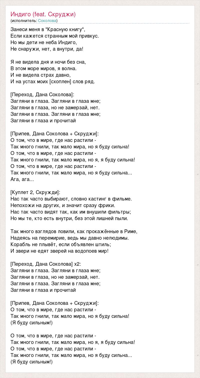 Занеси меня в "Красную книгу", Если кажется странным мой привкус. Но мы дети не неба Индиго, Не снаружи, нет, а внутри, да! Я не видела дня и ночи без сна, В этом море миров, я волна. И не видела страх давно, И на устах моих [схоплен] слов ряд. [Переход, Дана Соколова]: Загляни в глаза. Загляни в глаза мне; Загляни в глаза, но не замерзай, нет. Загляни в глаза. Загляни в глаза мне; Загляни в глаза и прочитай [Припев, Дана Соколова + Скруджи]: О том, что в мире, где нас растили - Так много гнили, так мало мира, но я буду сильна! О том, что в мире, где нас растили - Так много гнили, так мало мира, но я, я буду сильна! О том, что в мире, где нас растили - Так много гнили, так мало мира, но я буду сильна... Ага, ага... [Куплет 2, Скружди]: Нас так часто выбирают, словно кастинг в фильме. Непохожи на других, и значит сразу фрики. Нас так часто видят так, как им внушили фильтры; Но мы те, кто есть внутри, без этой лишней пыли. Так много взглядов ловили, как прокажённые в Риме, Надеясь на перемирие, ведь мы давно нелюдимы. Корабль не плывёт, если объявлен штиль; И звери не едят зверей на водопоев мир! [Переход, Дана Соколова] x2: Загляни в глаза. Загляни в глаза мне; Загляни в глаза, но не замерзай, нет. Загляни в глаза. Загляни в глаза мне; Загляни в глаза и прочитай [Припев, Дана Соколова + Скруджи]: О том, что в мире, где нас растили - Так много гнили, так мало мира, но я буду сильна! (Я буду сильным!) О том, что в мире, где нас растили - Так много гнили, так мало мира, но я, я буду сильна! О том, что в мире, где нас растили - Так много гнили, так мало мира, но я буду сильна... (Я буду сильным!)