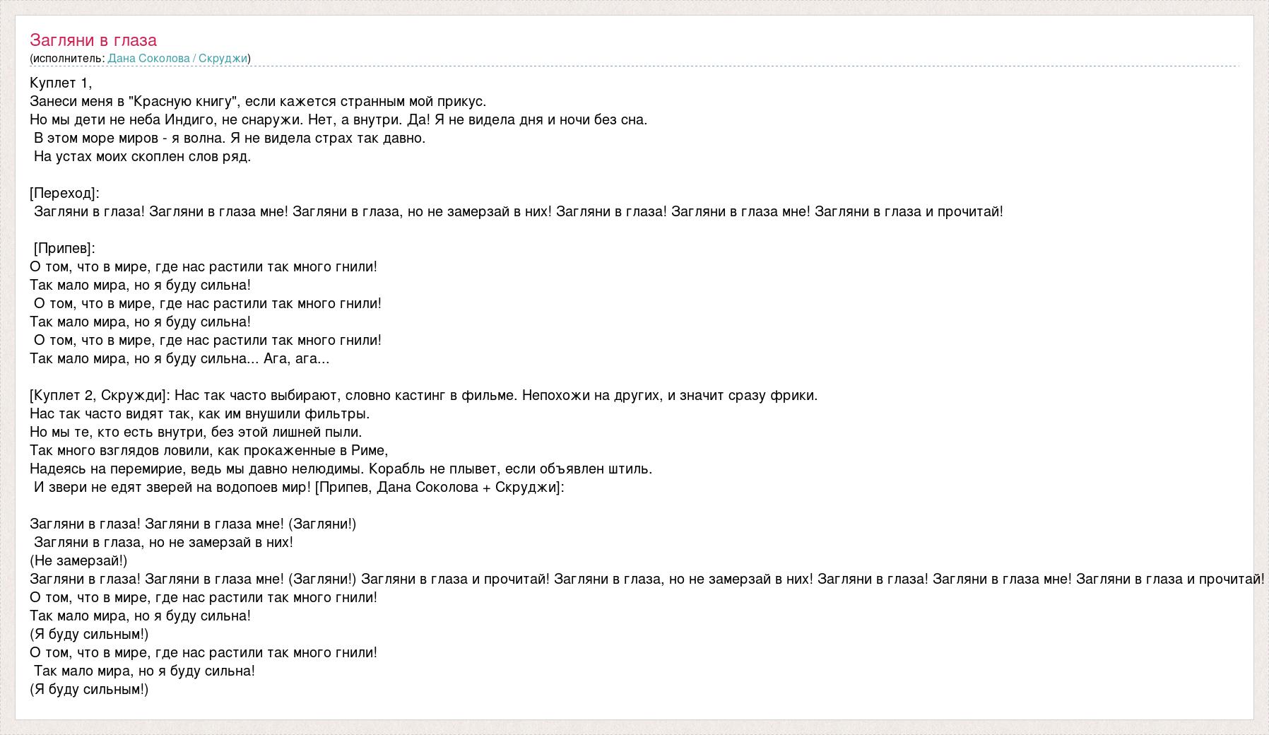 Куплет 1, Занеси меня в "Красную книгу", если кажется странным мой прикус. Но мы дети не неба Индиго, не снаружи. Нет, а внутри. Да! Я не видела дня и ночи без сна. В этом море миров - я волна. Я не видела страх так давно. На устах моих скоплен слов ряд. [Переход]: Загляни в глаза! Загляни в глаза мне! Загляни в глаза, но не замерзай в них! Загляни в глаза! Загляни в глаза мне! Загляни в глаза и прочитай! [Припев]: О том, что в мире, где нас растили так много гнили! Так мало мира, но я буду сильна! О том, что в мире, где нас растили так много гнили! Так мало мира, но я буду сильна! О том, что в мире, где нас растили так много гнили! Так мало мира, но я буду сильна... Ага, ага... [Куплет 2, Скружди]: Нас так часто выбирают, словно кастинг в фильме. Непохожи на других, и значит сразу фрики. Нас так часто видят так, как им внушили фильтры. Но мы те, кто есть внутри, без этой лишней пыли. Так много взглядов ловили, как прокаженные в Риме, Надеясь на перемирие, ведь мы давно нелюдимы. Корабль не плывет, если объявлен штиль. И звери не едят зверей на водопоев мир! [Припев, Дана Соколова + Скруджи]: Загляни в глаза! Загляни в глаза мне! (Загляни!) Загляни в глаза, но не замерзай в них! (Не замерзай!) Загляни в глаза! Загляни в глаза мне! (Загляни!) Загляни в глаза и прочитай! Загляни в глаза, но не замерзай в них! Загляни в глаза! Загляни в глаза мне! Загляни в глаза и прочитай! О том, что в мире, где нас растили так много гнили! Так мало мира, но я буду сильна! (Я буду сильным!) О том, что в мире, где нас растили так много гнили! Так мало мира, но я буду сильна! (Я буду сильным!)