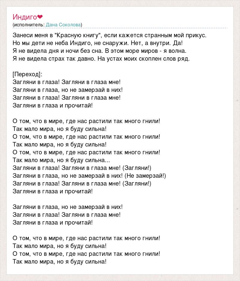 Занеси меня в "Красную книгу", если кажется странным мой прикус. Но мы дети не неба Индиго, не снаружи. Нет, а внутри. Да! Я не видела дня и ночи без сна. В этом море миров - я волна. Я не видела страх так давно. На устах моих скоплен слов ряд. [Переход]: Загляни в глаза! Загляни в глаза мне! Загляни в глаза, но не замерзай в них! Загляни в глаза! Загляни в глаза мне! Загляни в глаза и прочитай! О том, что в мире, где нас растили так много гнили! Так мало мира, но я буду сильна! О том, что в мире, где нас растили так много гнили! Так мало мира, но я буду сильна! О том, что в мире, где нас растили так много гнили! Так мало мира, но я буду сильна... Загляни в глаза! Загляни в глаза мне! (Загляни!) Загляни в глаза, но не замерзай в них! (Не замерзай!) Загляни в глаза! Загляни в глаза мне! (Загляни!) Загляни в глаза и прочитай! Загляни в глаза, но не замерзай в них! Загляни в глаза! Загляни в глаза мне! Загляни в глаза и прочитай! О том, что в мире, где нас растили так много гнили! Так мало мира, но я буду сильна! О том, что в мире, где нас растили так много гнили! Так мало мира, но я буду сильна!