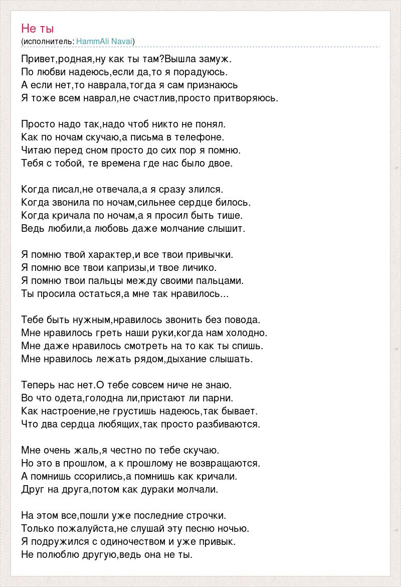 Привет,родная,ну как ты там?Вышла замуж. По любви надеюсь,если да,то я порадуюсь. А если нет,то наврала,тогда я сам признаюсь Я тоже всем наврал,не счастлив,просто притворяюсь. Просто надо так,надо чтоб никто не понял. Как по ночам скучаю,а письма в телефоне. Читаю перед сном просто до сих пор я помню. Тебя с тобой, те времена где нас было двое. Когда писал,не отвечала,а я сразу злился. Когда звонила по ночам,сильнее сердце билось. Когда кричала по ночам,а я просил быть тише. Ведь любили,а любовь даже молчание слышит. Я помню твой характер,и все твои привычки. Я помню все твои капризы,и твое личико. Я помню твои пальцы между своими пальцами. Ты просила остаться,а мне так нравилось... Тебе быть нужным,нравилось звонить без повода. Мне нравилось греть наши руки,когда нам холодно. Мне даже нравилось смотреть на то как ты спишь. Мне нравилось лежать рядом,дыхание слышать. Теперь нас нет.О тебе совсем ниче не знаю. Во что одета,голодна ли,пристают ли парни. Как настроение,не грустишь надеюсь,так бывает. Что два сердца любящих,так просто разбиваются. Мне очень жаль,я честно по тебе скучаю. Но это в прошлом, а к прошлому не возвращаются. А помнишь ссорились,а помнишь как кричали. Друг на друга,потом как дураки молчали. На этом все,пошли уже последние строчки. Только пожалуйста,не слушай эту песню ночью. Я подружился с одиночеством и уже привык. Не полюблю другую,ведь она не ты.
