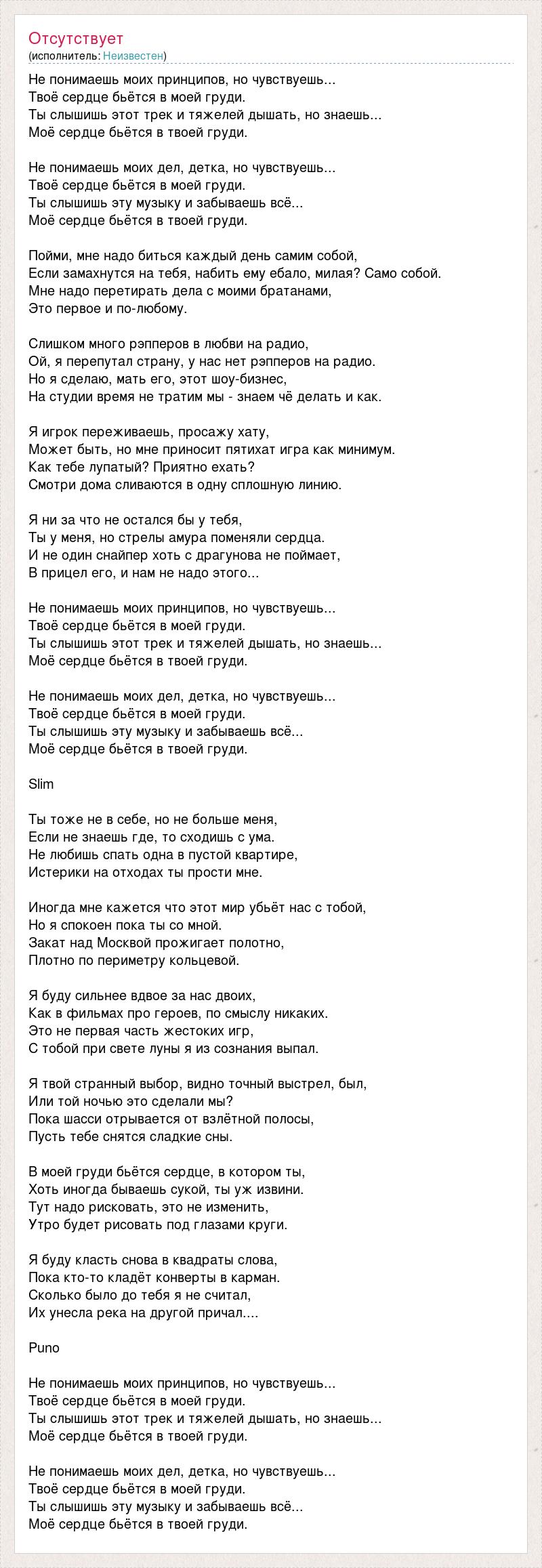 Не понимаешь моих принципов, но чувствуешь... Твоё сердце бьётся в моей груди. Ты слышишь этот трек и тяжелей дышать, но знаешь... Моё сердце бьётся в твоей груди. Не понимаешь моих дел, детка, но чувствуешь... Твоё сердце бьётся в моей груди. Ты слышишь эту музыку и забываешь всё... Моё сердце бьётся в твоей груди. Пойми, мне надо биться каждый день самим собой, Если замахнутся на тебя, набить ему ебало, милая? Само собой. Мне надо перетирать дела с моими братанами, Это первое и по-любому. Слишком много рэпперов в любви на радио, Ой, я перепутал страну, у нас нет рэпперов на радио. Но я сделаю, мать его, этот шоу-бизнес, На студии время не тратим мы - знаем чё делать и как. Я игрок переживаешь, просажу хату, Может быть, но мне приносит пятихат игра как минимум. Как тебе лупатый? Приятно ехать? Смотри дома сливаются в одну сплошную линию. Я ни за что не остался бы у тебя, Ты у меня, но стрелы амура поменяли сердца. И не один снайпер хоть с драгунова не поймает, В прицел его, и нам не надо этого... Не понимаешь моих принципов, но чувствуешь... Твоё сердце бьётся в моей груди. Ты слышишь этот трек и тяжелей дышать, но знаешь... Моё сердце бьётся в твоей груди. Не понимаешь моих дел, детка, но чувствуешь... Твоё сердце бьётся в моей груди. Ты слышишь эту музыку и забываешь всё... Моё сердце бьётся в твоей груди. Slim Ты тоже не в себе, но не больше меня, Если не знаешь где, то сходишь с ума. Не любишь спать одна в пустой квартире, Истерики на отходах ты прости мне. Иногда мне кажется что этот мир убьёт нас с тобой, Но я спокоен пока ты со мной. Закат над Москвой прожигает полотно, Плотно по периметру кольцевой. Я буду сильнее вдвое за нас двоих, Как в фильмах про героев, по смыслу никаких. Это не первая часть жестоких игр, С тобой при свете луны я из сознания выпал. Я твой странный выбор, видно точный выстрел, был, Или той ночью это сделали мы? Пока шасси отрывается от взлётной полосы, Пусть тебе снятся сладкие сны. В моей груди бьётся сердце, в котором ты, Хоть иногда бываешь сукой, ты уж извини. Тут надо рисковать, это не изменить, Утро будет рисовать под глазами круги. Я буду класть снова в квадраты слова, Пока кто-то кладёт конверты в карман. Сколько было до тебя я не считал, Их унесла река на другой причал.... Puno Не понимаешь моих принципов, но чувствуешь... Твоё сердце бьётся в моей груди. Ты слышишь этот трек и тяжелей дышать, но знаешь... Моё сердце бьётся в твоей груди. Не понимаешь моих дел, детка, но чувствуешь... Твоё сердце бьётся в моей груди. Ты слышишь эту музыку и забываешь всё... Моё сердце бьётся в твоей груди.