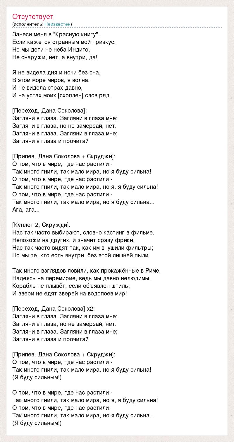 Занеси меня в "Красную книгу", Если кажется странным мой привкус. Но мы дети не неба Индиго, Не снаружи, нет, а внутри, да! Я не видела дня и ночи без сна, В этом море миров, я волна. И не видела страх давно, И на устах моих [схоплен] слов ряд. [Переход, Дана Соколова]: Загляни в глаза. Загляни в глаза мне; Загляни в глаза, но не замерзай, нет. Загляни в глаза. Загляни в глаза мне; Загляни в глаза и прочитай [Припев, Дана Соколова + Скруджи]: О том, что в мире, где нас растили - Так много гнили, так мало мира, но я буду сильна! О том, что в мире, где нас растили - Так много гнили, так мало мира, но я, я буду сильна! О том, что в мире, где нас растили - Так много гнили, так мало мира, но я буду сильна... Ага, ага... [Куплет 2, Скружди]: Нас так часто выбирают, словно кастинг в фильме. Непохожи на других, и значит сразу фрики. Нас так часто видят так, как им внушили фильтры; Но мы те, кто есть внутри, без этой лишней пыли. Так много взглядов ловили, как прокажённые в Риме, Надеясь на перемирие, ведь мы давно нелюдимы. Корабль не плывёт, если объявлен штиль; И звери не едят зверей на водопоев мир! [Переход, Дана Соколова] x2: Загляни в глаза. Загляни в глаза мне; Загляни в глаза, но не замерзай, нет. Загляни в глаза. Загляни в глаза мне; Загляни в глаза и прочитай [Припев, Дана Соколова + Скруджи]: О том, что в мире, где нас растили - Так много гнили, так мало мира, но я буду сильна! (Я буду сильным!) О том, что в мире, где нас растили - Так много гнили, так мало мира, но я, я буду сильна! О том, что в мире, где нас растили - Так много гнили, так мало мира, но я буду сильна... (Я буду сильным!)