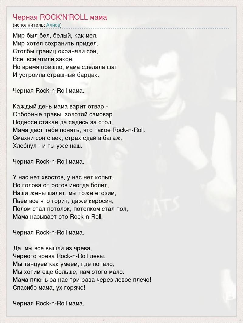 Мир был бел, белый, как мел. Мир хотел сохранить придел. Столбы границ охраняли сон, Все, все чтили закон, Но время пришло, мама сделала шаг И устроила страшный бардак. Черная Rock-n-Roll мама. Каждый день мама варит отвар - Отборные травы, золотой самовар. Подноси стакан да садись за стол, Мама даст тебе понять, что такое Rock-n-Roll. Смахни сон с век, страх сдай в багаж, Хлебнул - и ты уже наш. Черная Rock-n-Roll мама. У нас нет хвостов, у нас нет копыт, Но голова от рогов иногда болит, Наши жены шалят, мы тоже егозим, Пьем все что горит, даже керосин, Полом стал потолок, потолком стал пол, Мама называет это Rock-n-Roll. Черная Rock-n-Roll мама. Да, мы все вышли из чрева, Черного чрева Rock-n-Roll девы. Мы танцуем как умеем, где попало, Мы хотим еще больше, нам этого мало. Мама плюнь за нас три раза через левое плечо! Спасибо мама, ух горячо! Черная Rock-n-Roll мама.