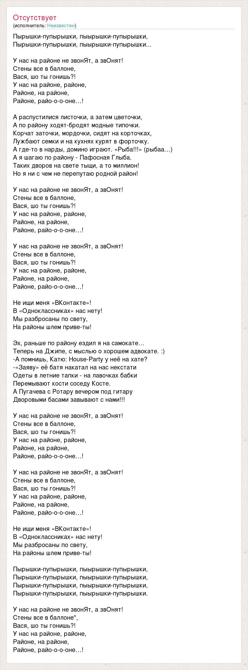 Пырышки-пупырышки, пыырышки-пупырышки, Пырышки-пупырышки, пыырышки-пупырышки... У нас на районе не звонЯт, а звОнят! Стены все в баллоне, Вася, шо ты гонишь?! У нас на районе, районе, Районе, на районе, Районе, райо-о-о-оне…! А распустилися листочки, а затем цветочки, А по району ходят-бродят модные типочки. Корчат заточки, мордочки, сидят на корточках, Лужбают семки и на кухнях курят в форточку. А где-то в нарды, домино играют. «Рыба!!!» (рыбаа…) А я шагаю по району - Пафосная Глыба. Таких дворов на свете тыщи, а то миллион! Но я ни с чем не перепутаю родной район! У нас на районе не звонЯт, а звОнят! Стены все в баллоне, Вася, шо ты гонишь?! У нас на районе, районе, Районе, на районе, Районе, райо-о-о-оне…! У нас на районе не звонЯт, а звОнят! Стены все в баллоне, Вася, шо ты гонишь?! У нас на районе, районе, Районе, на районе, Районе, райо-о-о-оне…! Не ищи меня «ВКонтакте»! В «Одноклассниках» нас нету! Мы разбросаны по свету, На районы шлем приве-ты! Эх, раньше по району ездил я на самокате… Теперь на Джипе, с мыслью о хорошем адвокате. :) -А помнишь, Катю: House-Party у неё на хате? -«Заяву» её батя накатал на нас некстати Одеты в летние тапки - на лавочках бабки Перемывают кости соседу Косте. А Пугачева с Ротару вечером под гитару Дворовыми басами завывают с нами!!! У нас на районе не звонЯт, а звОнят! Стены все в баллоне, Вася, шо ты гонишь?! У нас на районе, районе, Районе, на районе, Районе, райо-о-о-оне…! У нас на районе не звонЯт, а звОнят! Стены все в баллоне, Вася, шо ты гонишь?! У нас на районе, районе, Районе, на районе, Районе, райо-о-о-оне…! Не ищи меня «ВКонтакте»! В «Одноклассниках» нас нету! Мы разбросаны по свету, На районы шлем приве-ты! Пырышки-пупырышки, пыырышки-пупырышки, Пырышки-пупырышки, пыырышки-пупырышки, Пырышки-пупырышки, пыырышки-пупырышки, Пырышки-пупырышки, пыырышки-пупырышки. У нас на районе не звонЯт, а звОнят! Стены все в баллоне*, Вася, шо ты гонишь?! У нас на районе, районе, Районе, на районе, Районе, райо-о-о-оне…!
