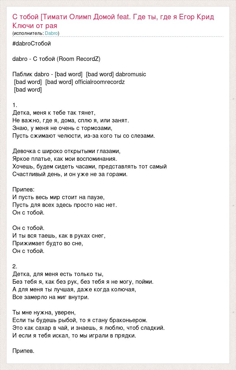 #dabroСтобой dabro - С тобой (Room RecordZ) Паблик dabro - [bad word] [bad word] dabromusic [bad word] [bad word] officialroomrecordz [bad word] 1. Детка, меня к тебе так тянет, Не важно, где я, дома, сплю я, или занят. Знаю, у меня не очень с тормозами, Пусть сжимают челюсти, из-за кого ты со слезами. Девочка с широко открытыми глазами, Яркое платье, как мои воспоминания. Хочешь, будем сидеть часами, представлять тот самый Счастливый день, и он уже не за горами. Припев: И пусть весь мир стоит на паузе, Пусть для всех здесь просто нас нет. Он с тобой. Он с тобой. И ты вся таешь, как в руках снег, Прижимает будто во сне, Он с тобой. 2. Детка, для меня есть только ты, Без тебя я, как без рук, без тебя я не могу, пойми. А для меня ты лучшая, даже когда колючая, Все замерло на миг внутри. Ты мне нужна, уверен, Если ты будешь рыбой, то я стану браконьером. Это как сахар в чай, и знаешь, я люблю, чтоб сладкий. И если я тебя искал, то мы играли в прядки. Припев.